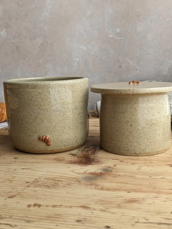 A handmade ceramic butter crock (or "butter keeper") with a mini croissant design. These are wheel-thrown and made from speckled, biscuit-coloured stoneware clay and with 2 handmade and hand-painted mini croissants. These are truly unique and a perfect ad...