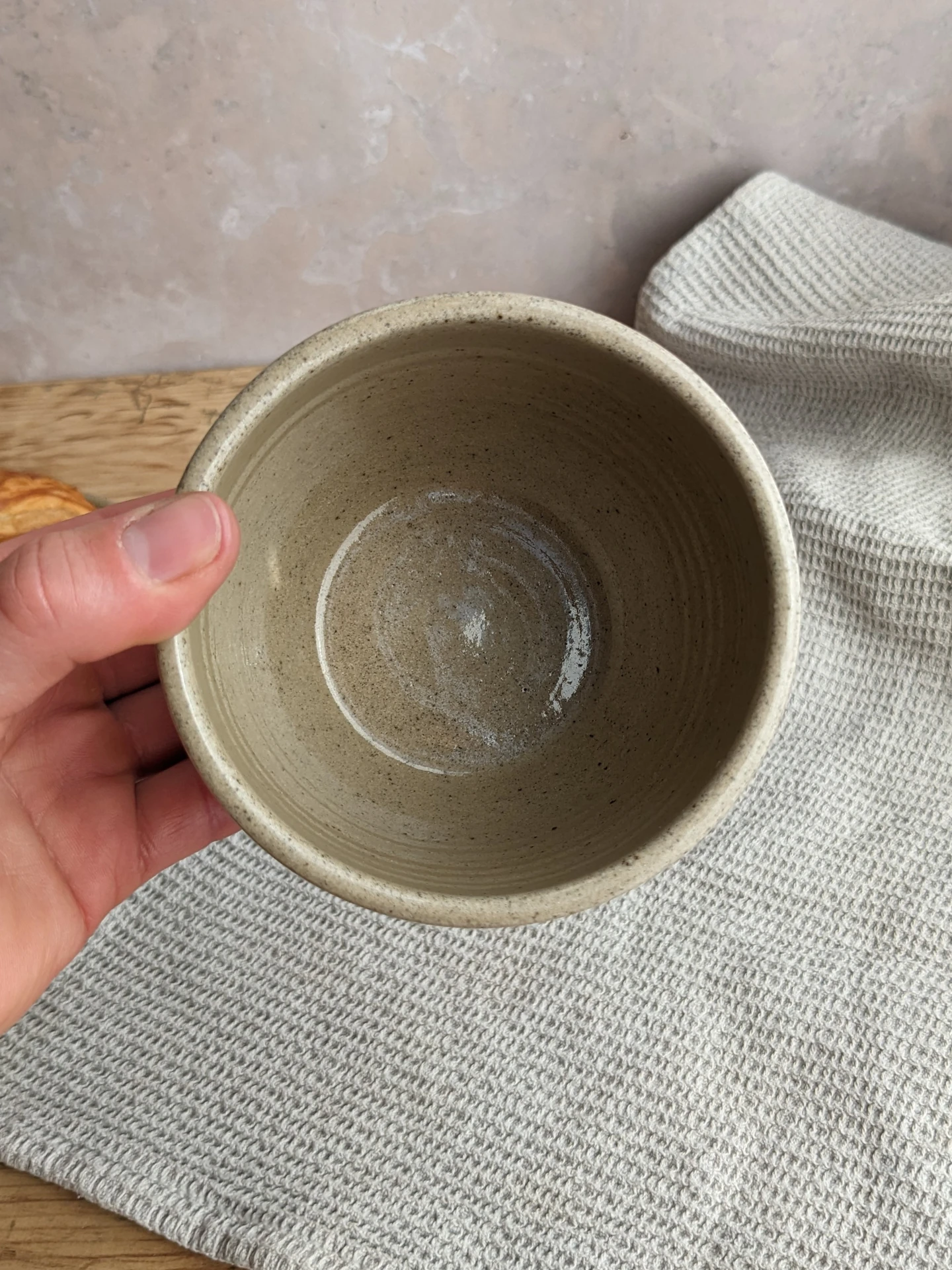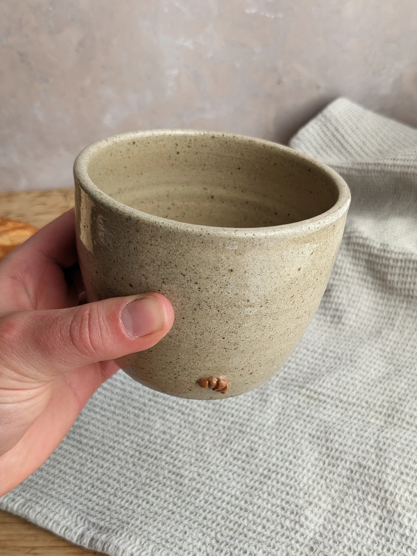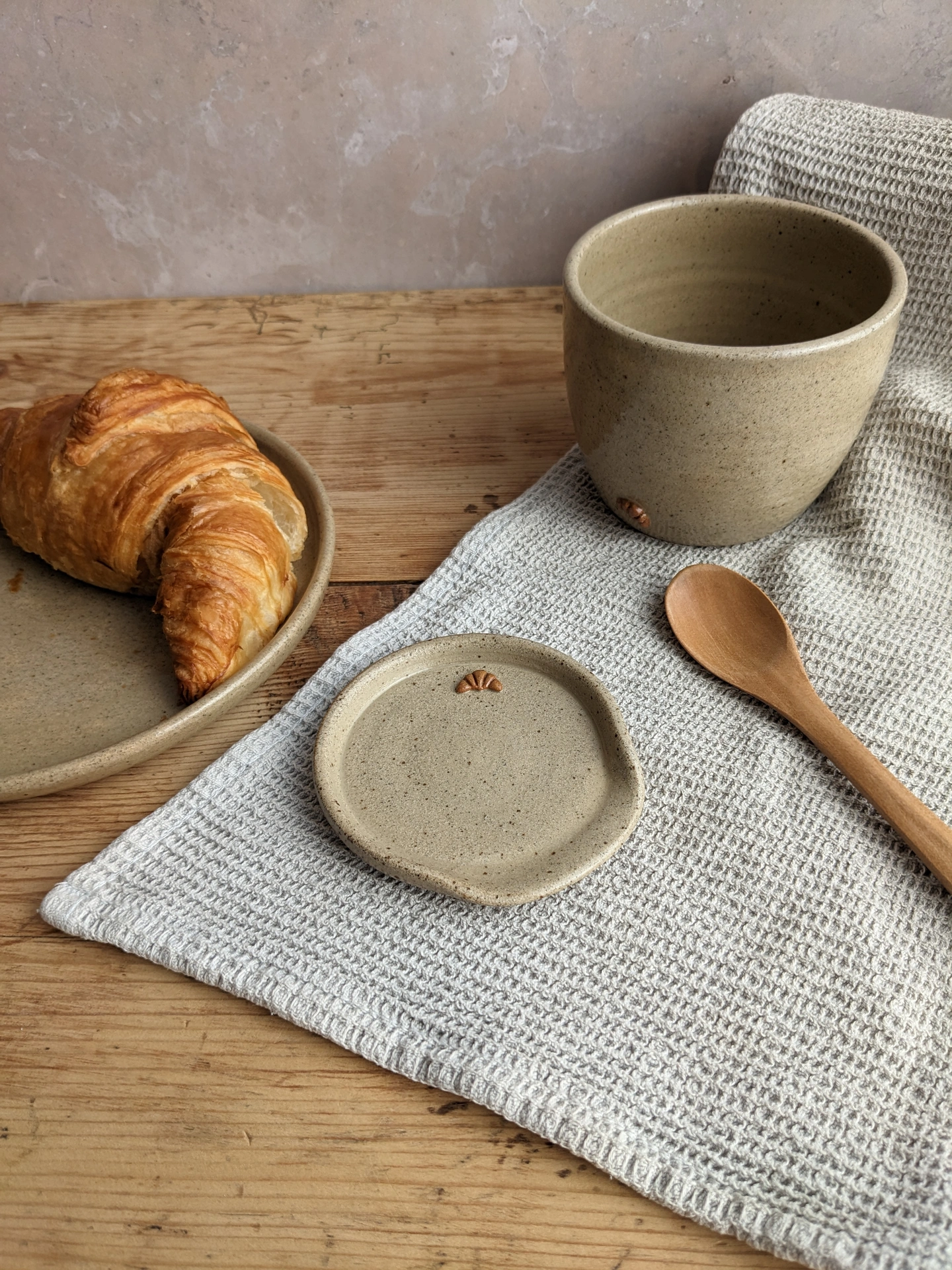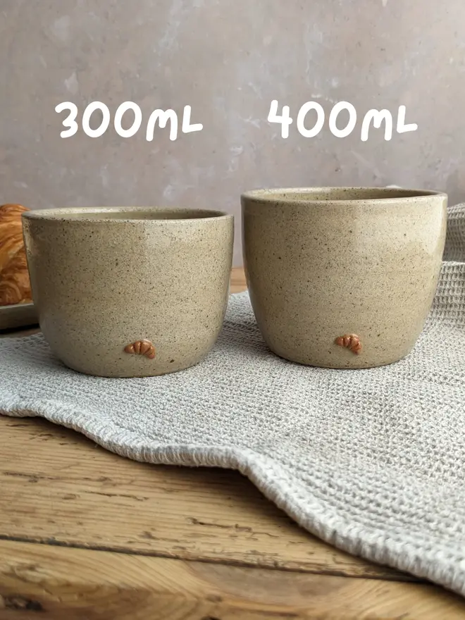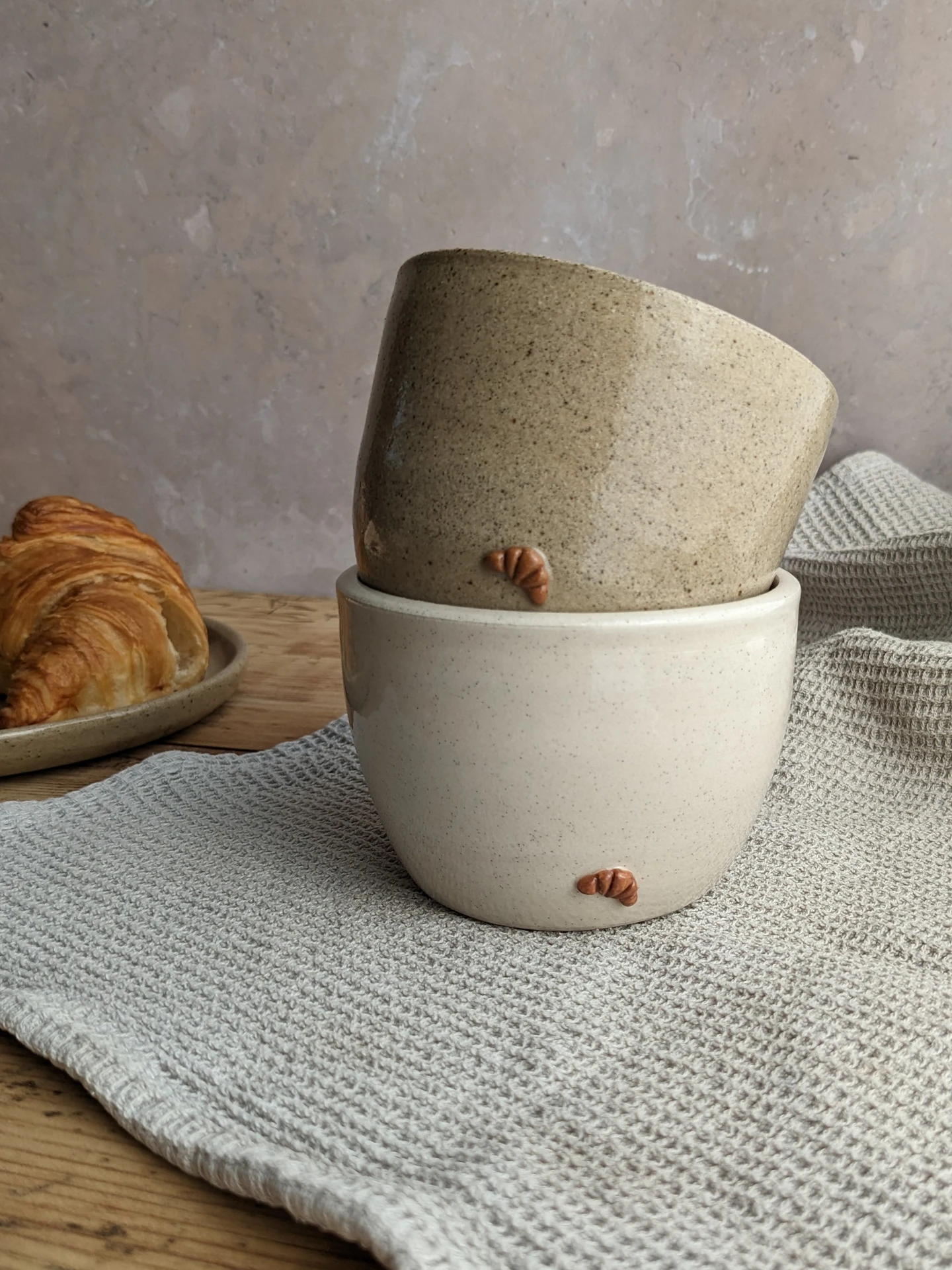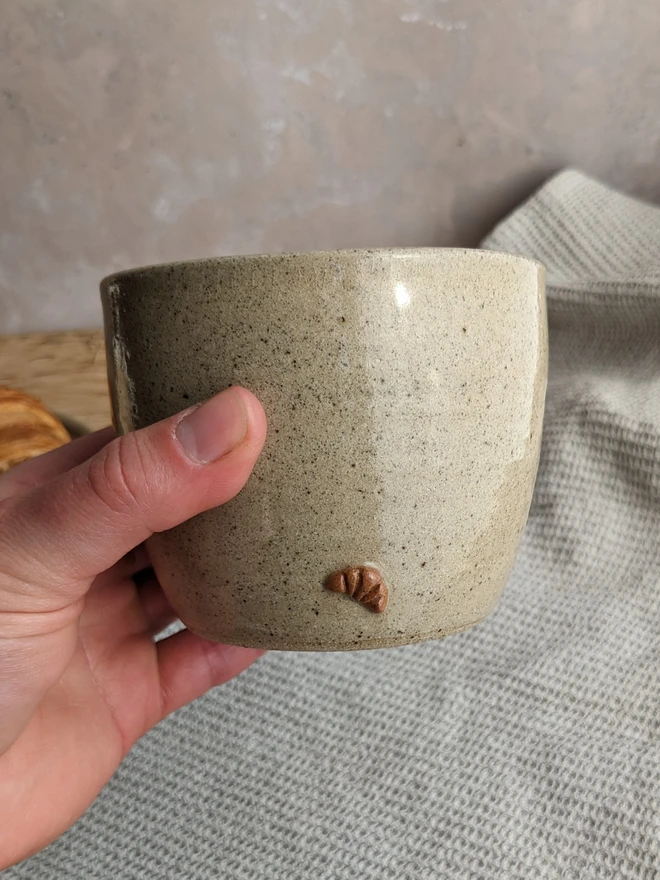 Each cup is individually wheel-thrown and finished with a mini, handmade and hand-painted ceramic croissant. Made from subtly speckled, biscuit-coloured stoneware, each one is slightly unique in its own way and they have their own handmade character. Perfect to make your morning routine a little more special, or as a cute, one-of-a-kind gift.