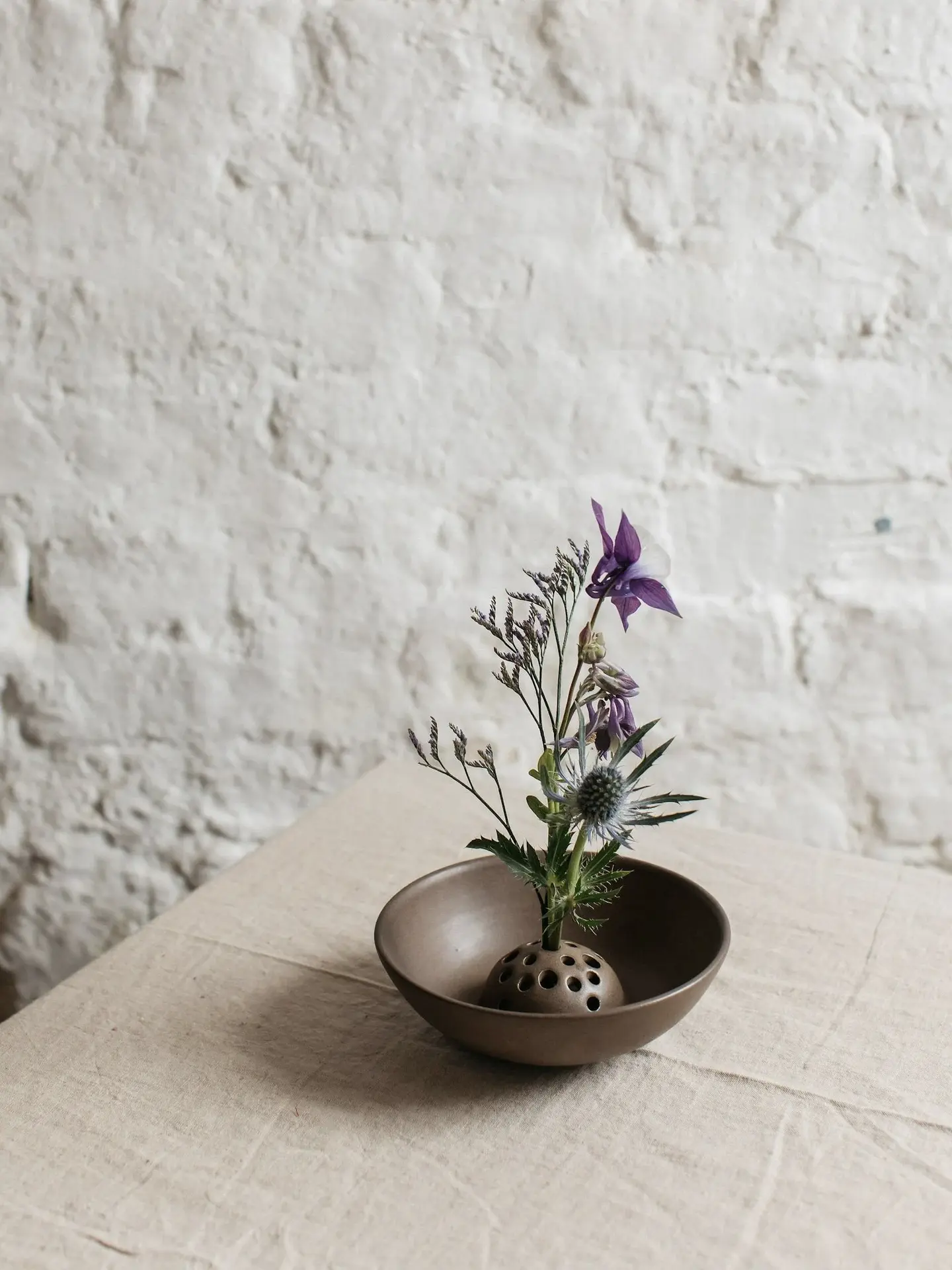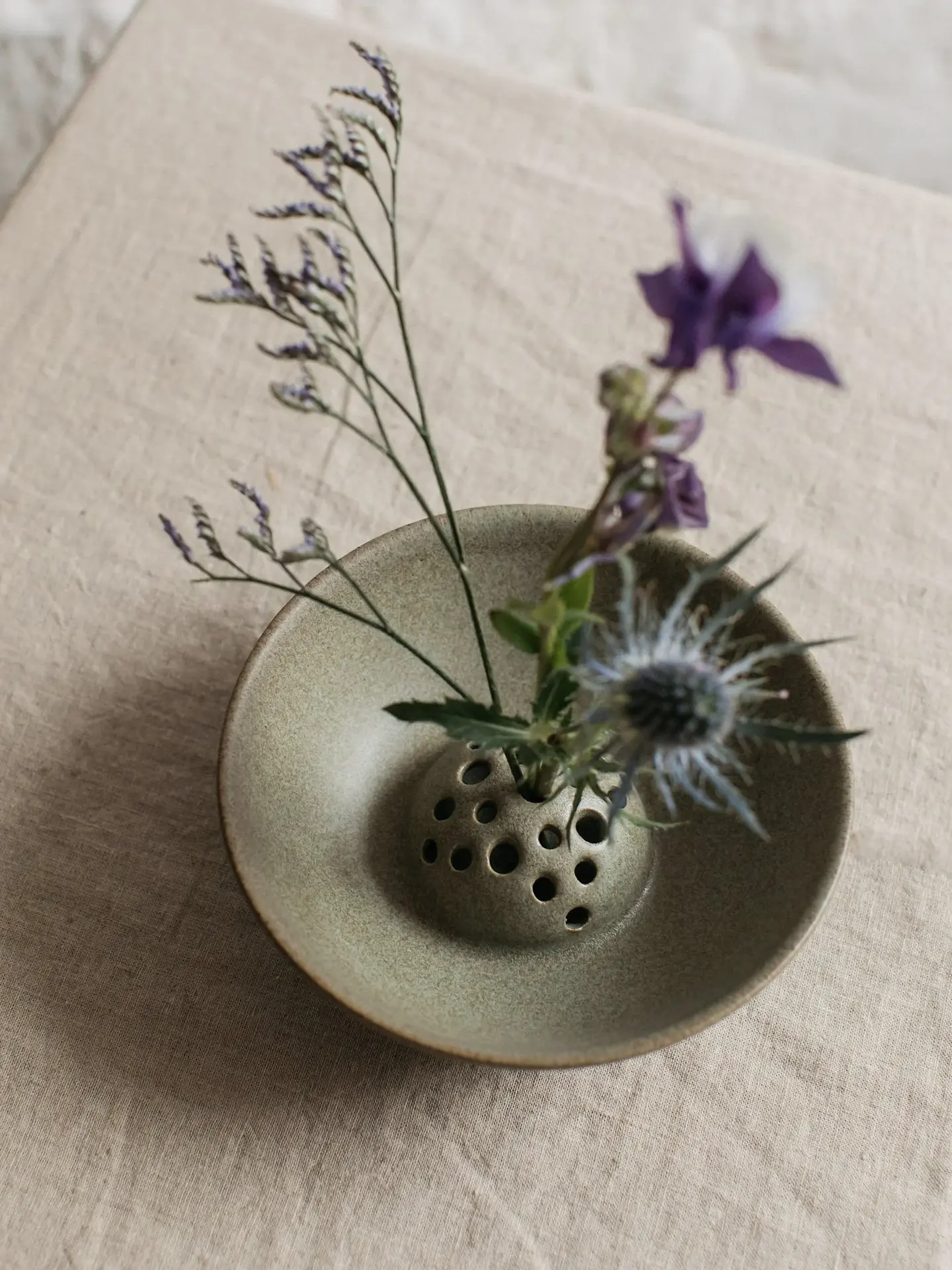 Ceramic stoneware Flower Bowl, made using a stoneware and glaze in a choice of three colours, Peak, Meadow and Moor. Perfect for displaying multiple dry or fresh stems...