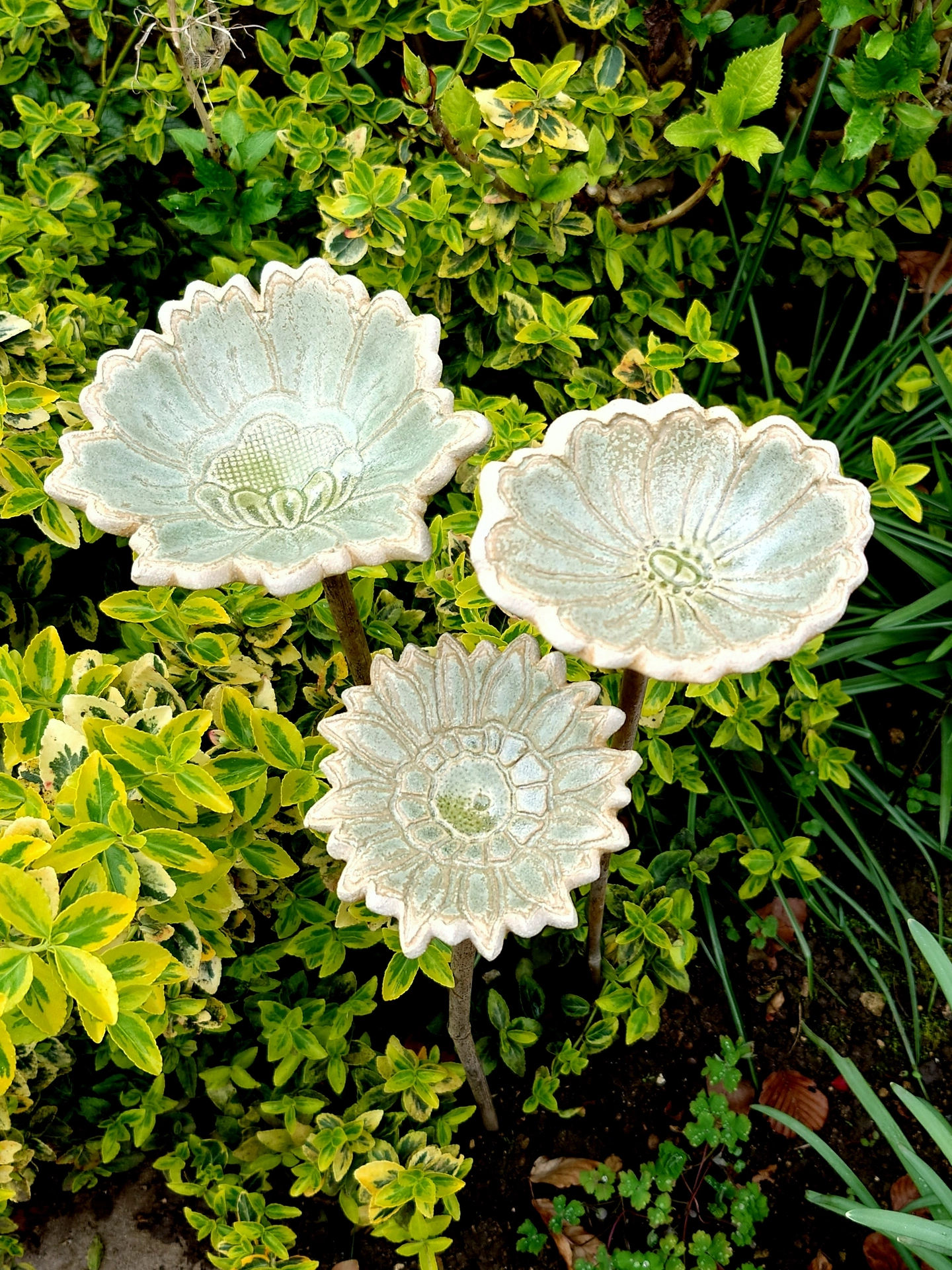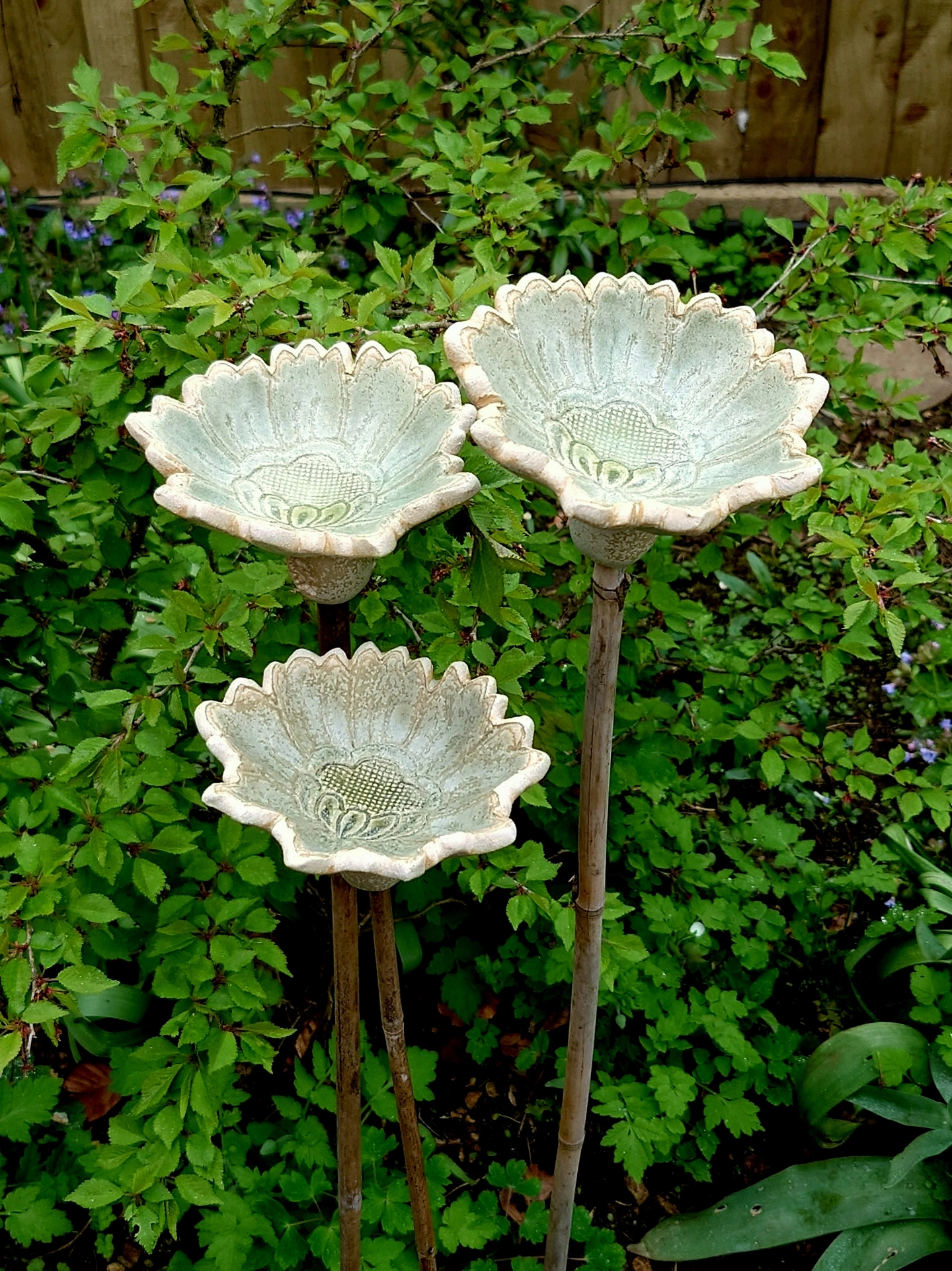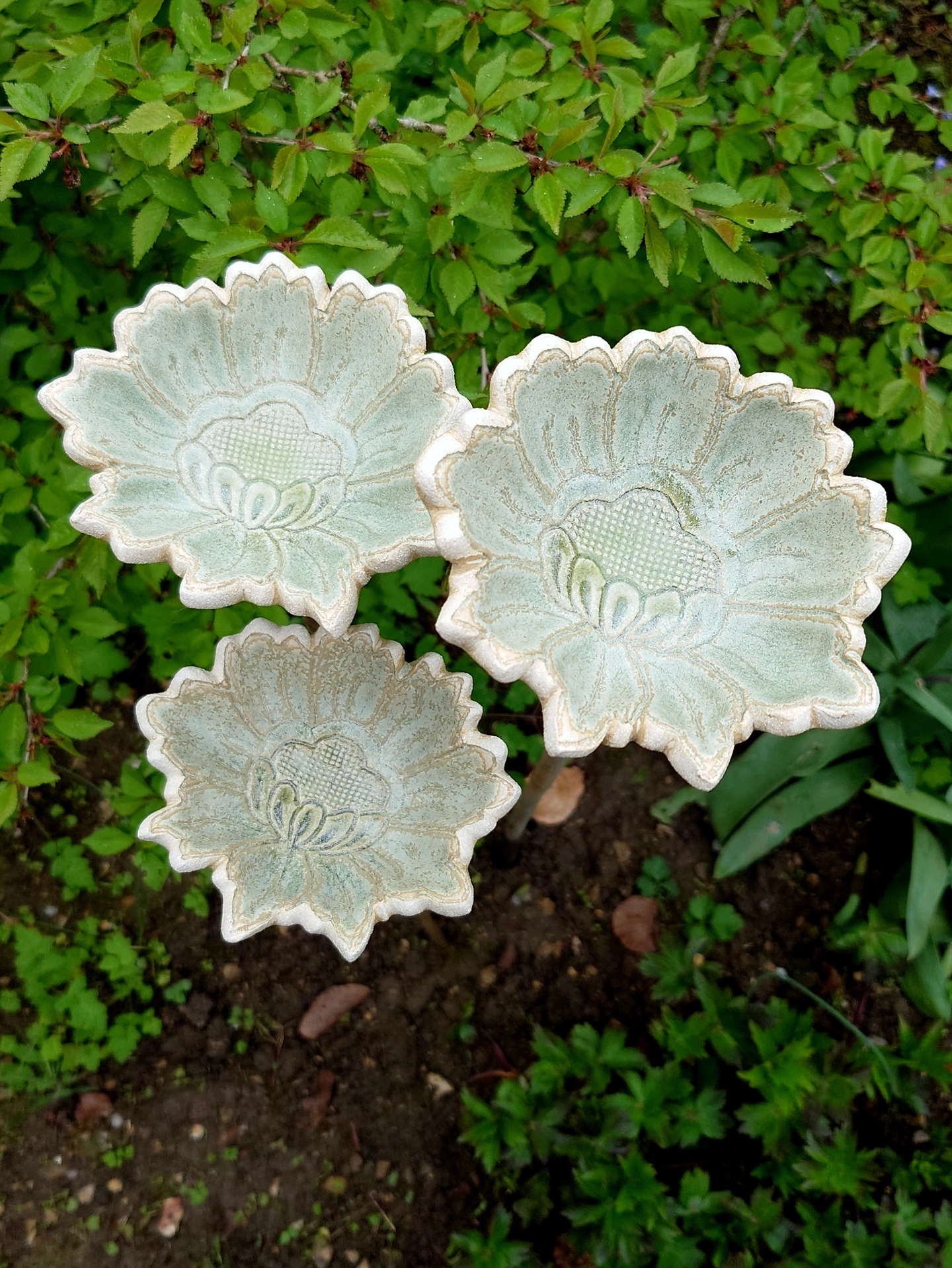 This beautiful flower cane topper is made from Stoneware clay and therefore perfect for the garden. It looks beautiful among my tomato plants which are in pots on my patio.