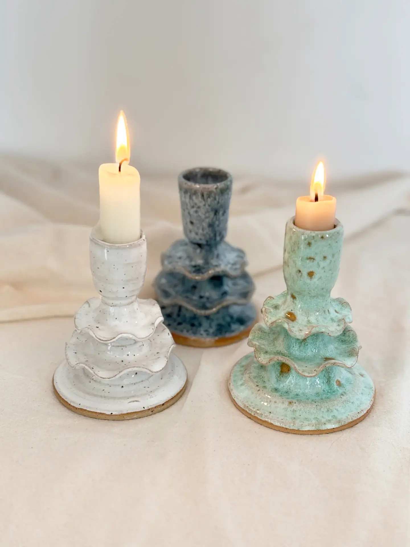 Beautiful glazed frilly ceramic candlestick holder in a choice of colours.
