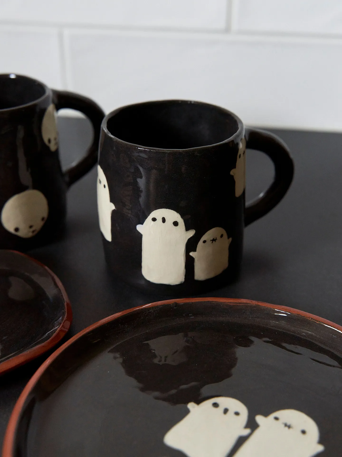 Earthenware hand-built black mug with either a painted ghost or skull design.