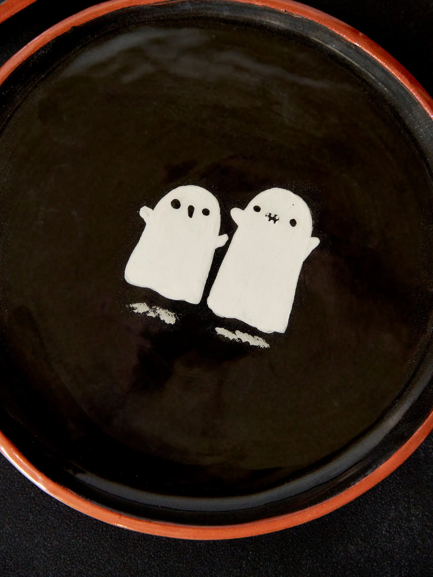 Handmade little black and white plate with two little ghosts on.