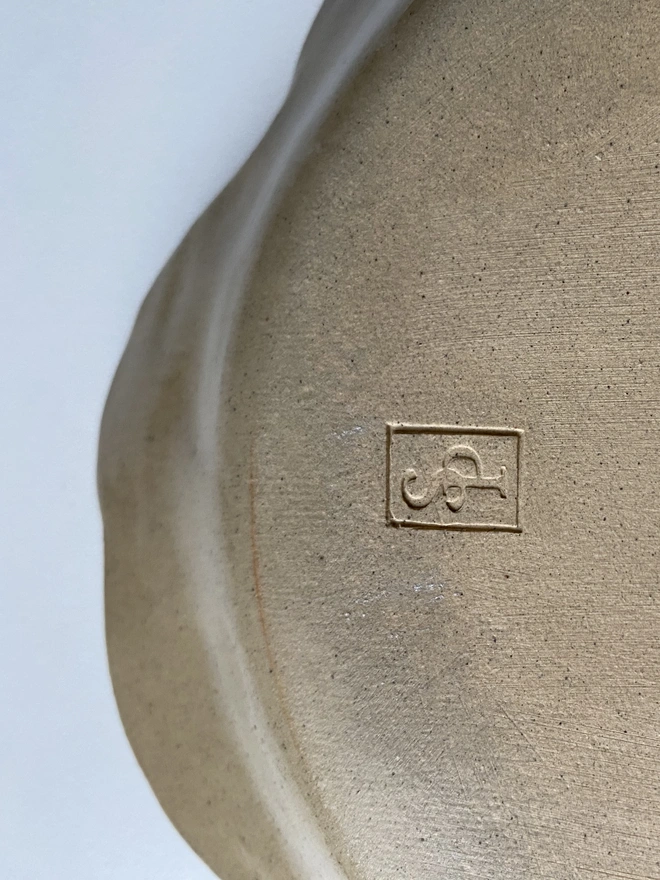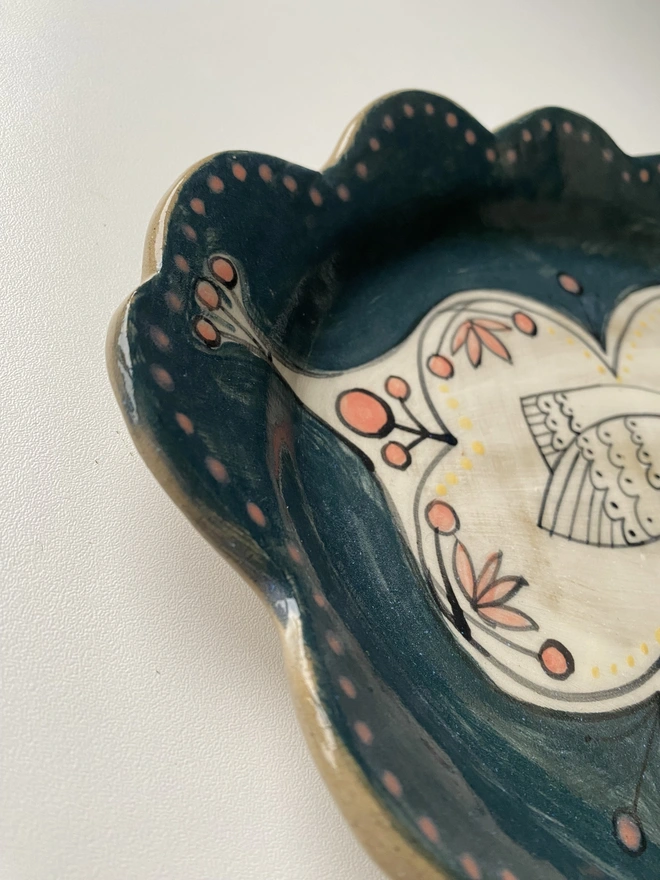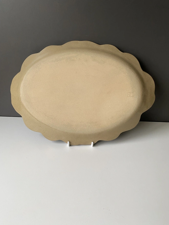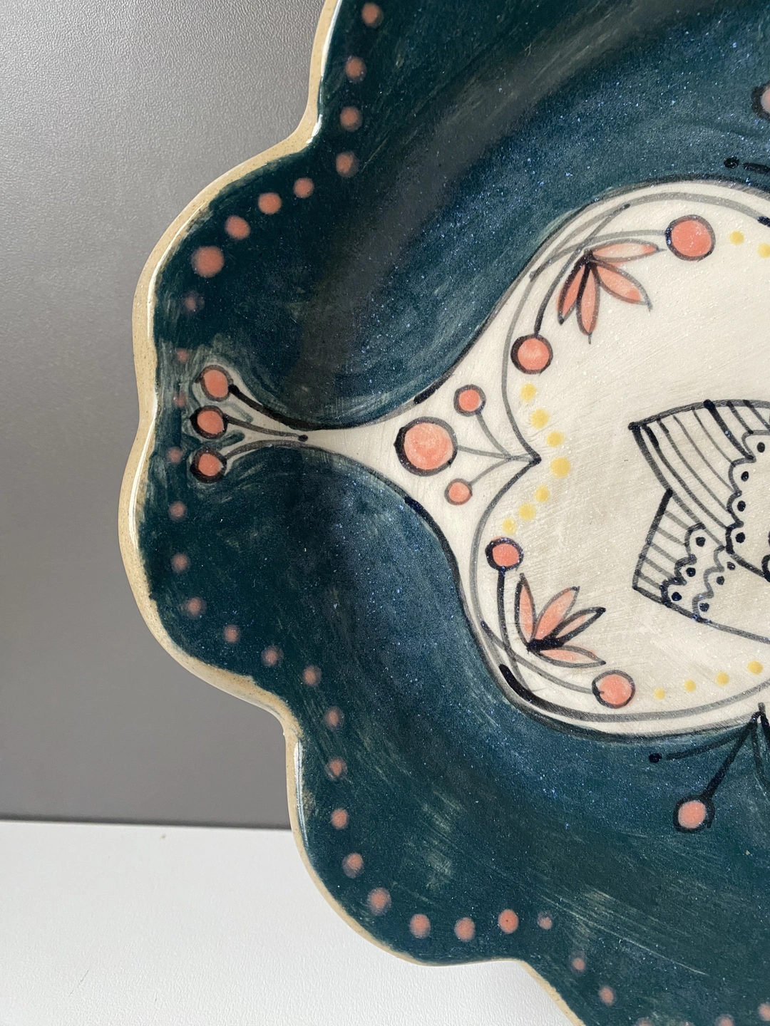Lovely large platter, handmade made with a paper template on buff stoneware clay. When leather hard the platter has been decorated with slips and underglazes. The edge of the platter has a lovely soft scallop and this is also reflected in the lovely soft...