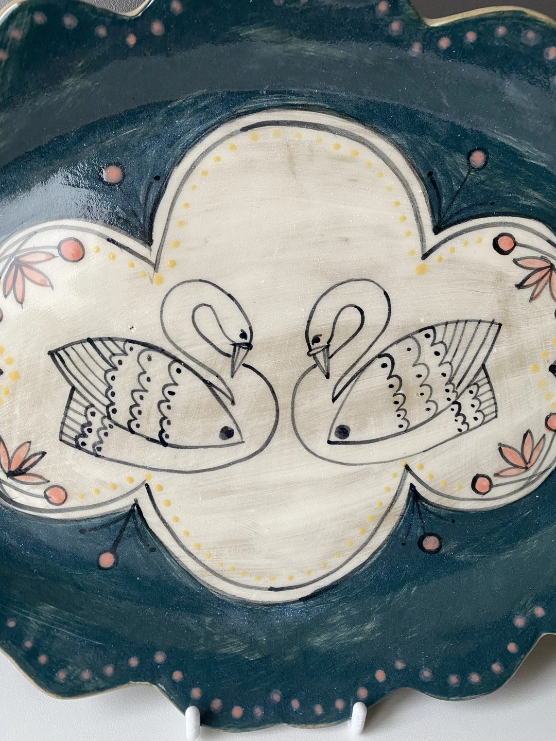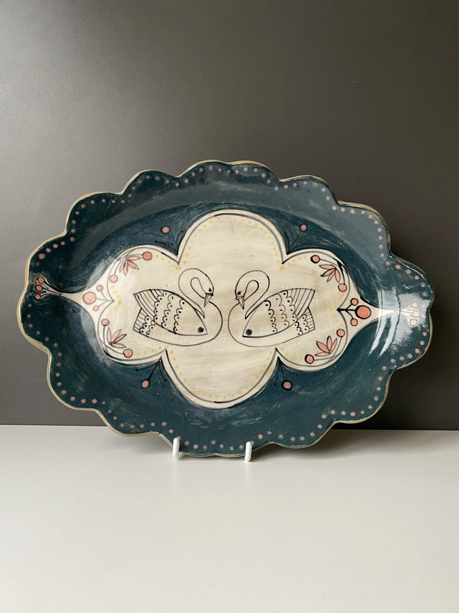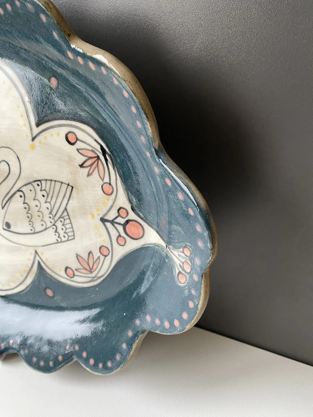 Lovely large platter, handmade made with a paper template on buff stoneware clay. When leather hard the platter has been decorated with slips and underglazes. The edge of the platter has a lovely soft scallop and this is also reflected in the lovely soft scallops in the swans wings.