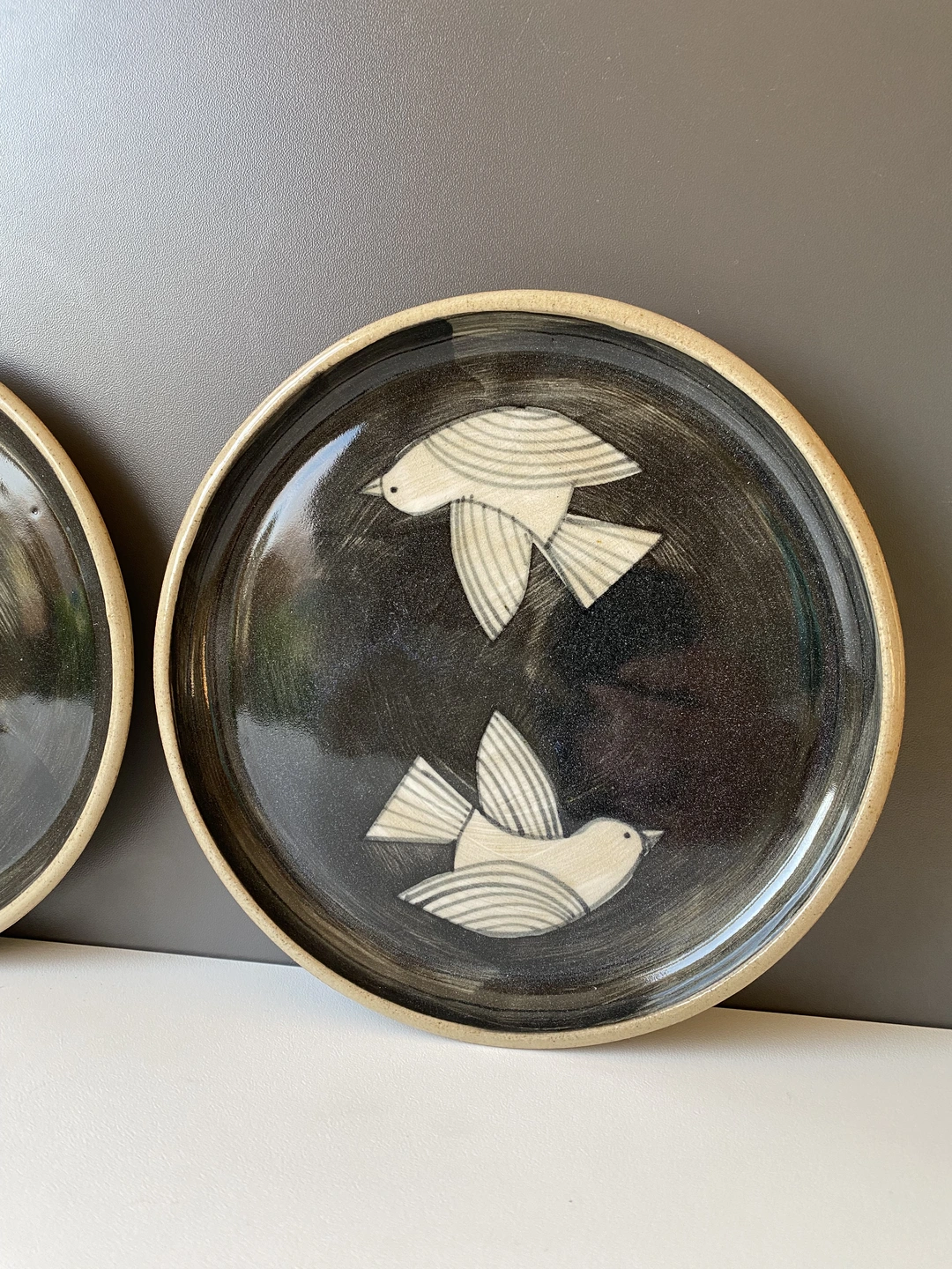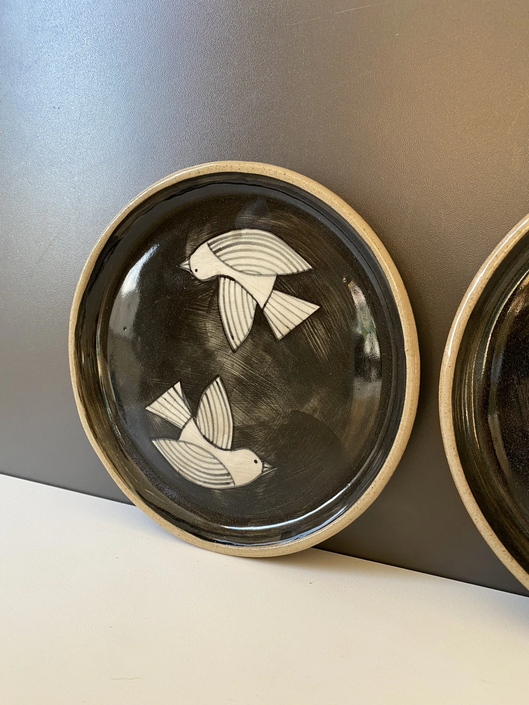 Small ceramic handmade dish, thrown on the wheel. Perfect to use for display keeping small items safe or on a wall or to use as a serving dish. Made with a stoneware buff clay, hand painted with slips and underglazes and glazed with a clear gloss glaze. Two birds on a black background inspired by mid century folk design. Fired to 1240 degrees in a glaze firing which makes the plate fit for purpose.