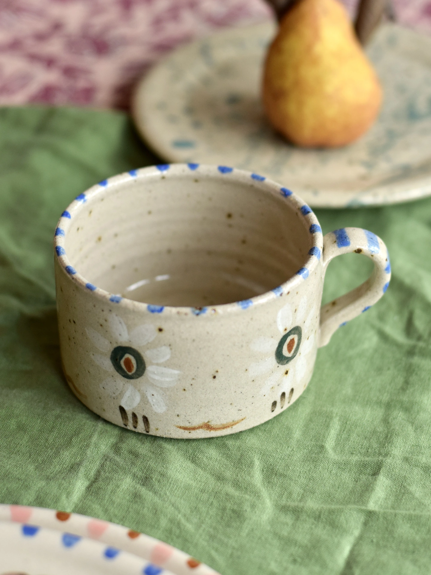 This ceramic mug is inspired by the paintings and patterns of Bloomsbury Artist, Vanessa Bell (1879-1961). These mugs are made in collaboration with Charleston. Each one is completely unique and handmade in my garden studio in Sussex, England. This range is called 'Nessa', it is hand painted with unique patterns with coloured underglazes. The speckles come from little flecks of iron within the body of the clay. When the piece fired it creates a lovely effect on the surface of the piece.