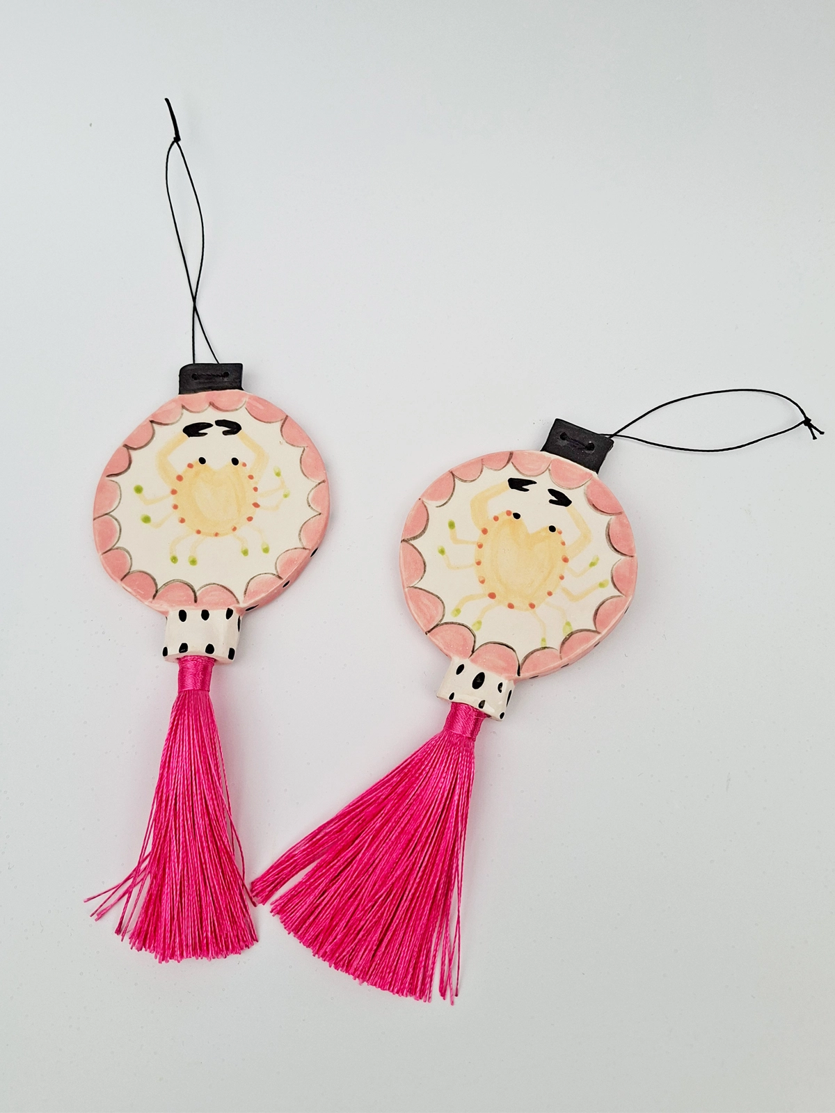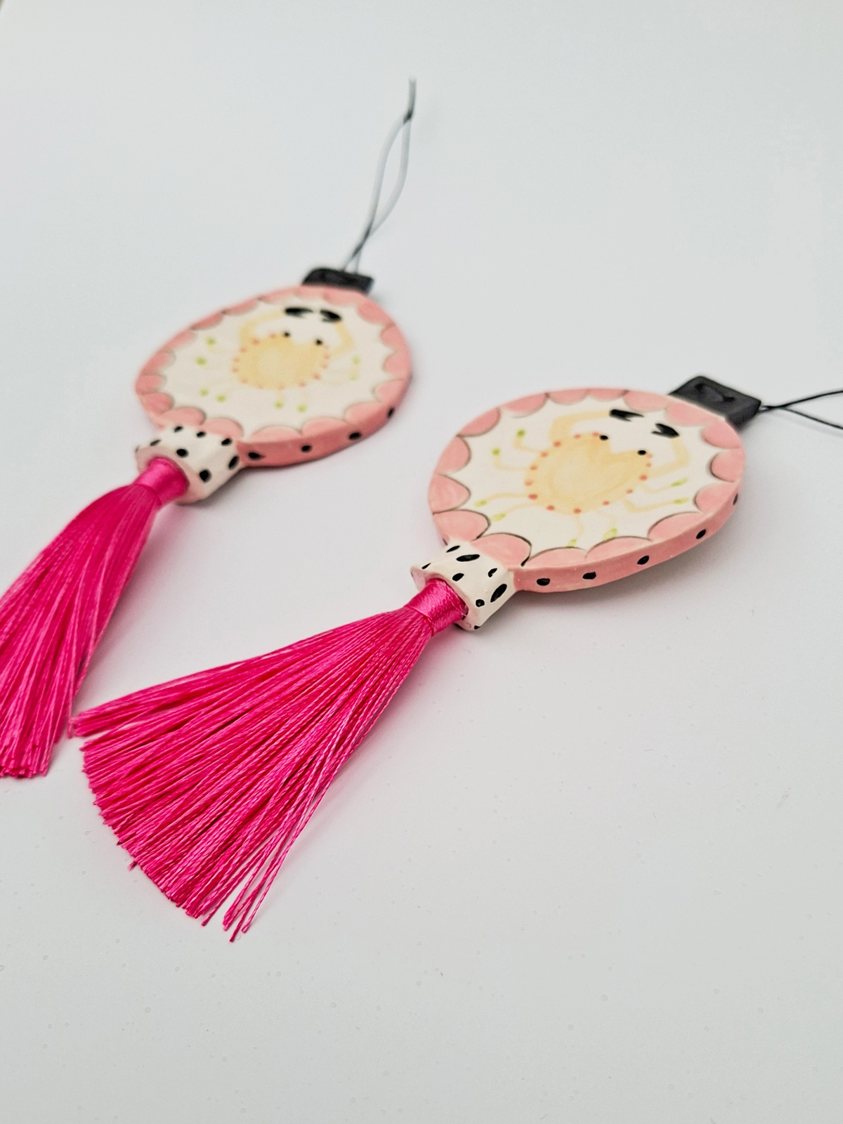 Handmade with earthenware clay, in small batches. Each design has an image on both sides and a tassel at the base.