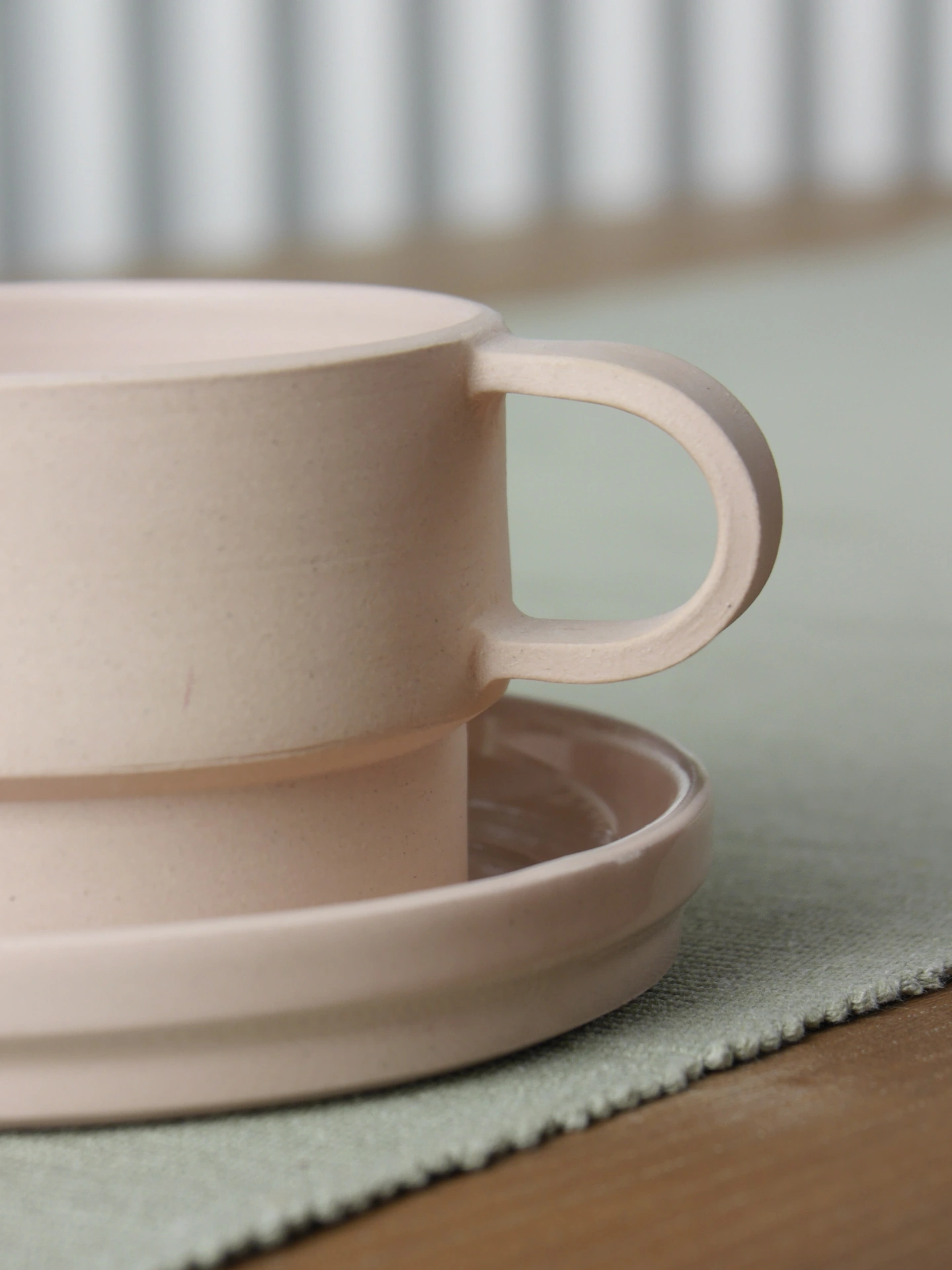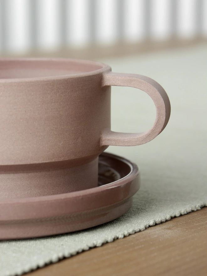 We use stains to colour the clay before throwing with it on the wheel, meaning that the cup and saucer are pigmented throughout