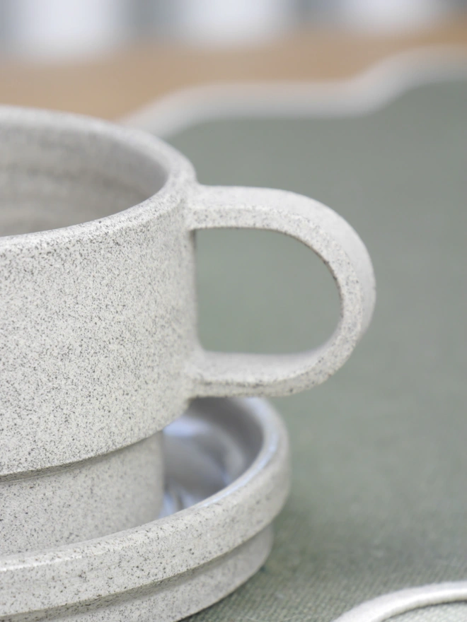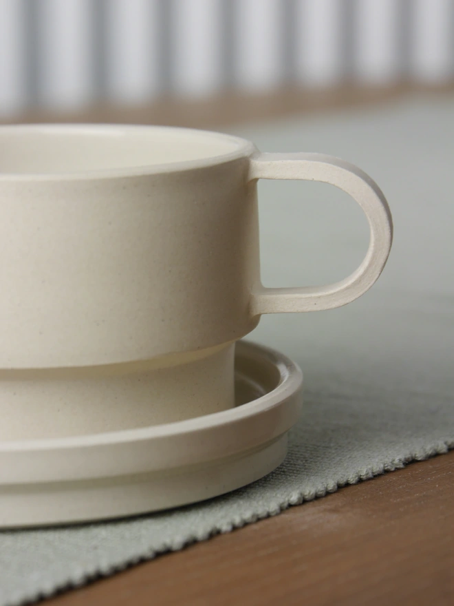 The saucer has an off-centre indent cut into the surface to fit the coffee mug. This off-centred feature not only gives a quirky aesthetic but it allows room for resting a tea spoon or stashing biscuits!