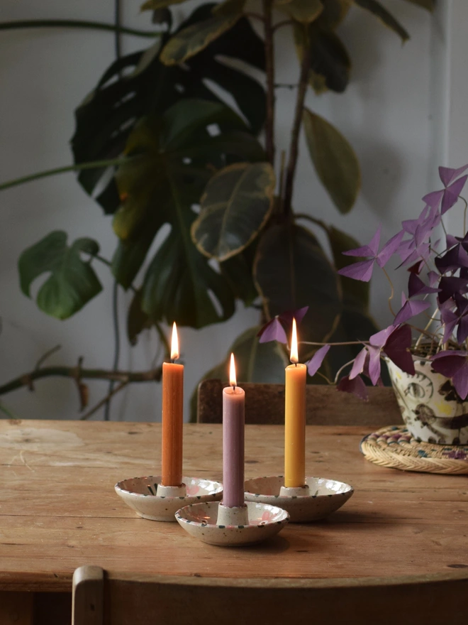 This ceramic candleholder is inspired by the paintings and patterns of Bloomsbury Artist, Vanessa Bell (1879-1961). Each one is completely unique and handmade in my garden studio in Sussex, England. This pattern is called 'Nessa', it is handpainted with unique patterns in coloured underglaze. They are made from iron rich stoneware clay which makes a lovely speckled effect on the surface of the glaze.