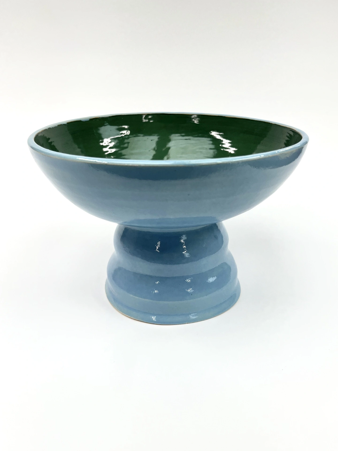 A bold, sculptural pedestal bowl that brings a fresh burst of colour to your table. Hand-made in London on the potter’s wheel using white stoneware and finished in a fresh sky blue on the outside, with a deep forest green rim and interior, it’s playful, m...