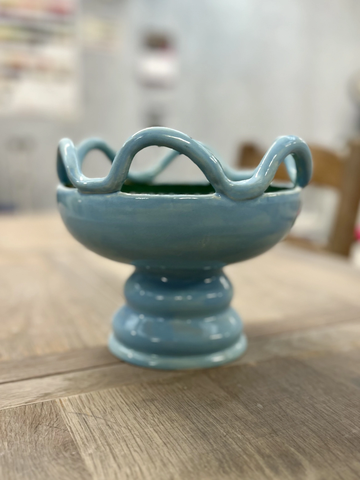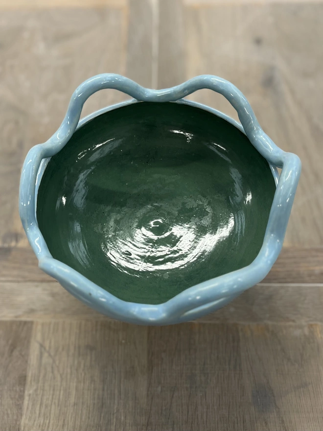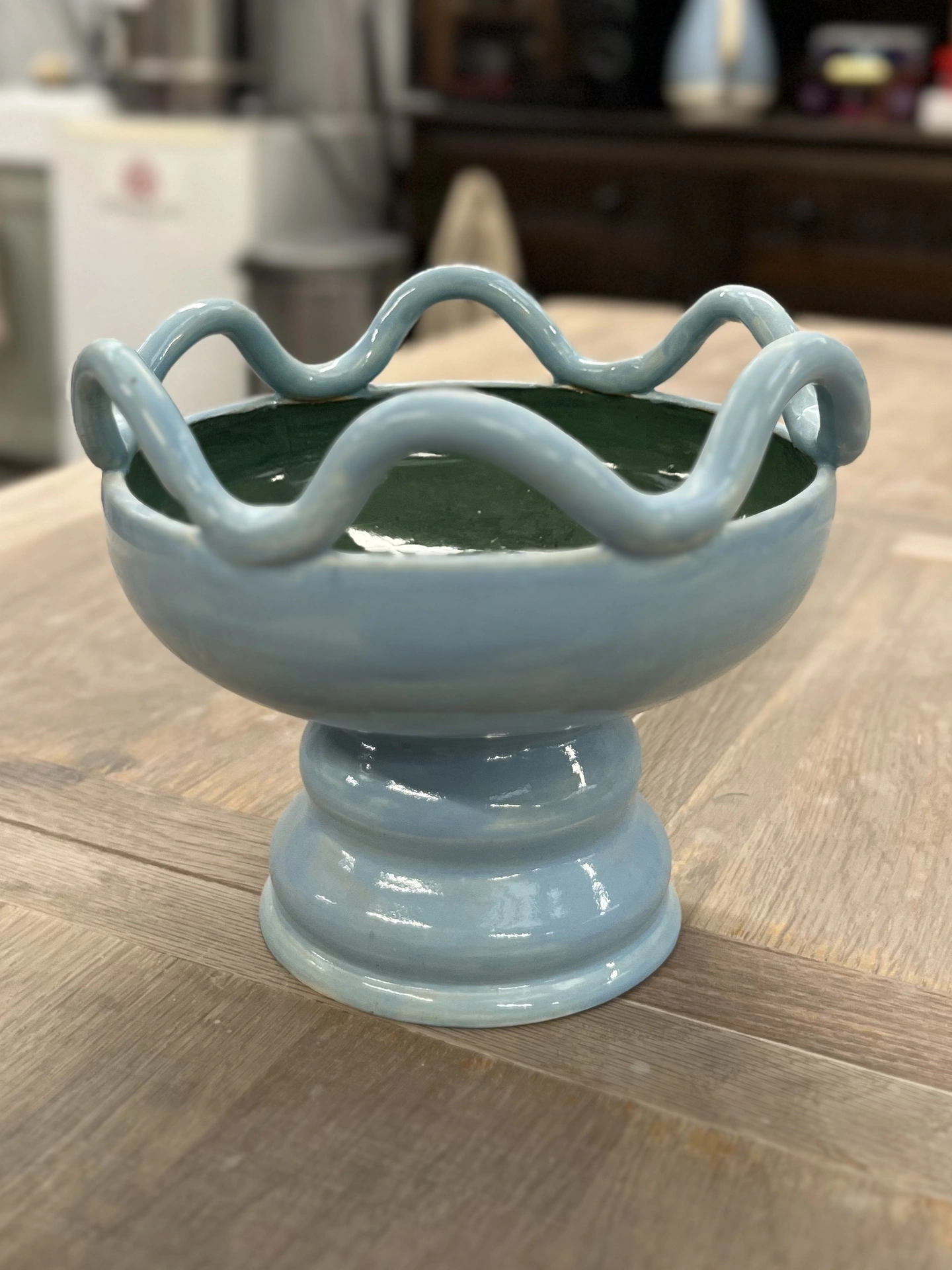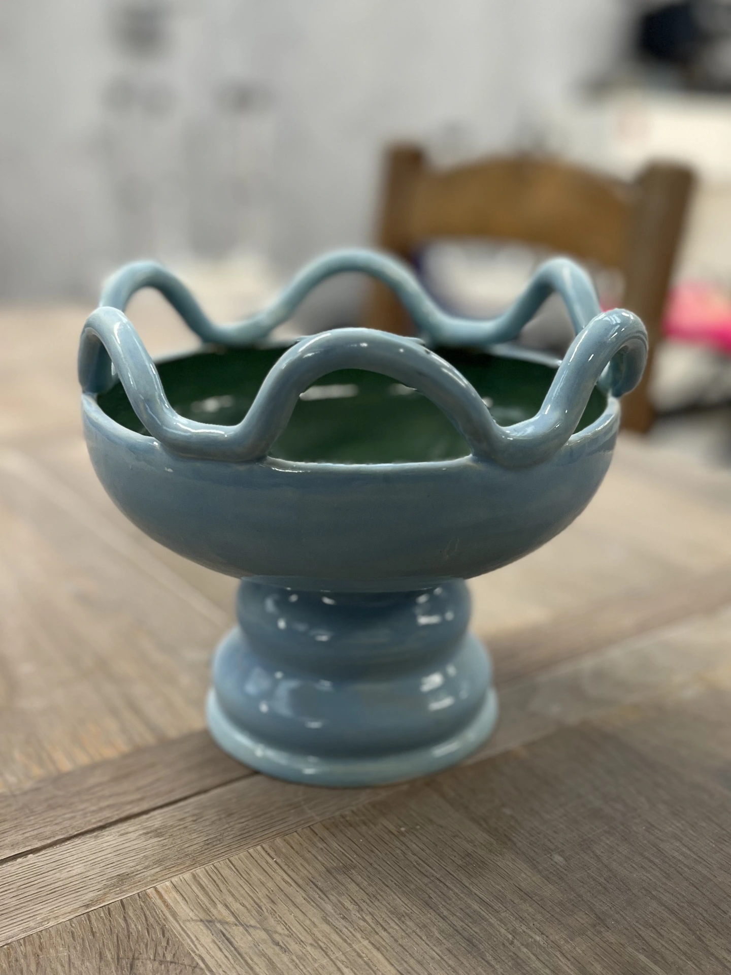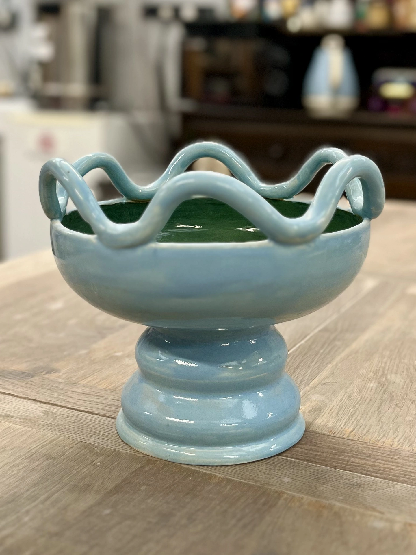 A bold, sculptural pedestal bowl that brings a fresh burst of colour to your table. Hand-made in London on the potter’s wheel using white stoneware and finished in a fresh sky blue on the outside, with a deep forest green rim and interior, it’s playful, modern, and functional.