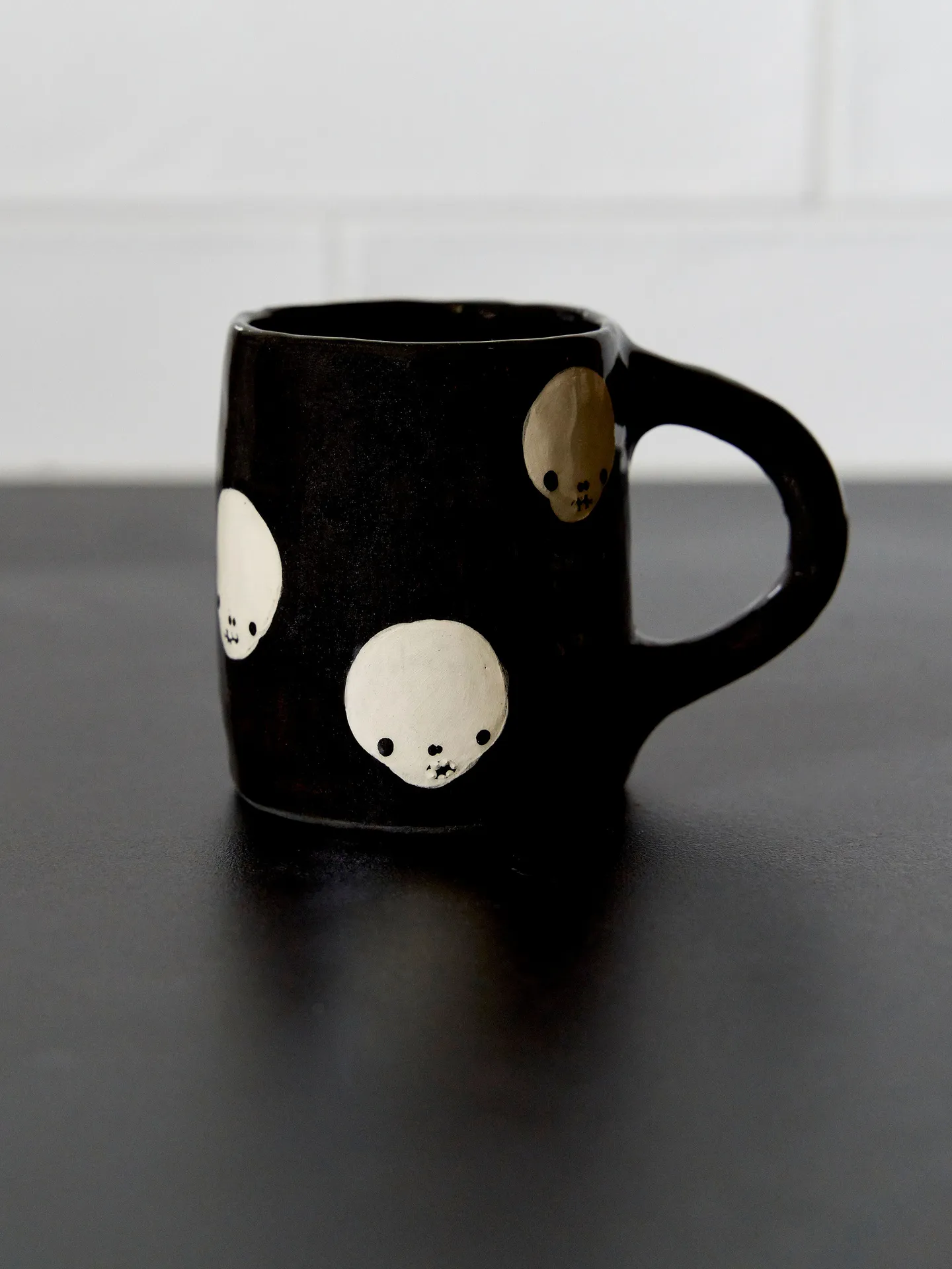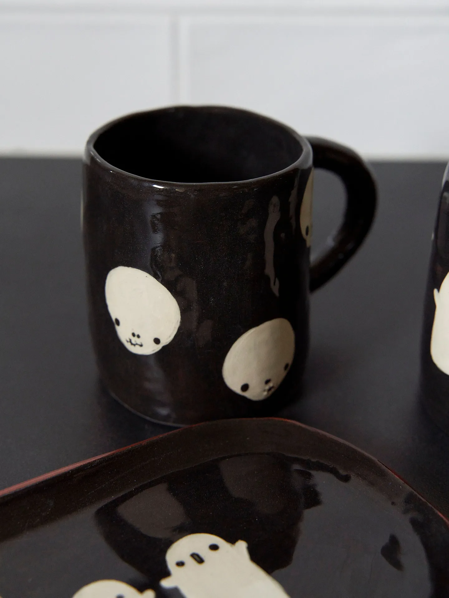 Earthenware hand-built black mug with either a painted ghost or skull design.