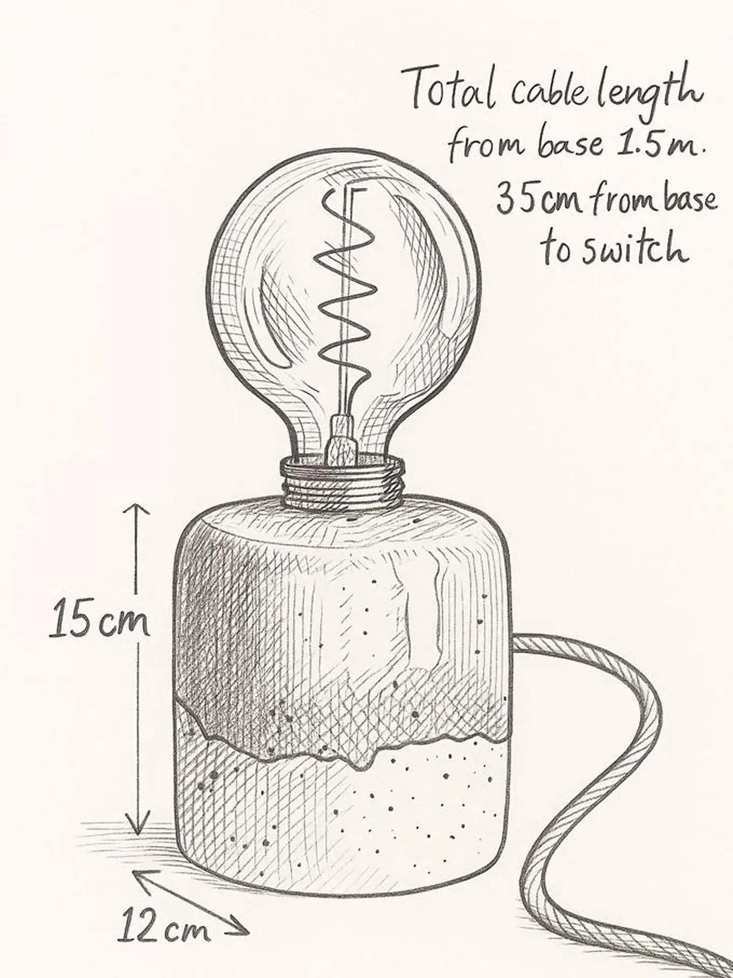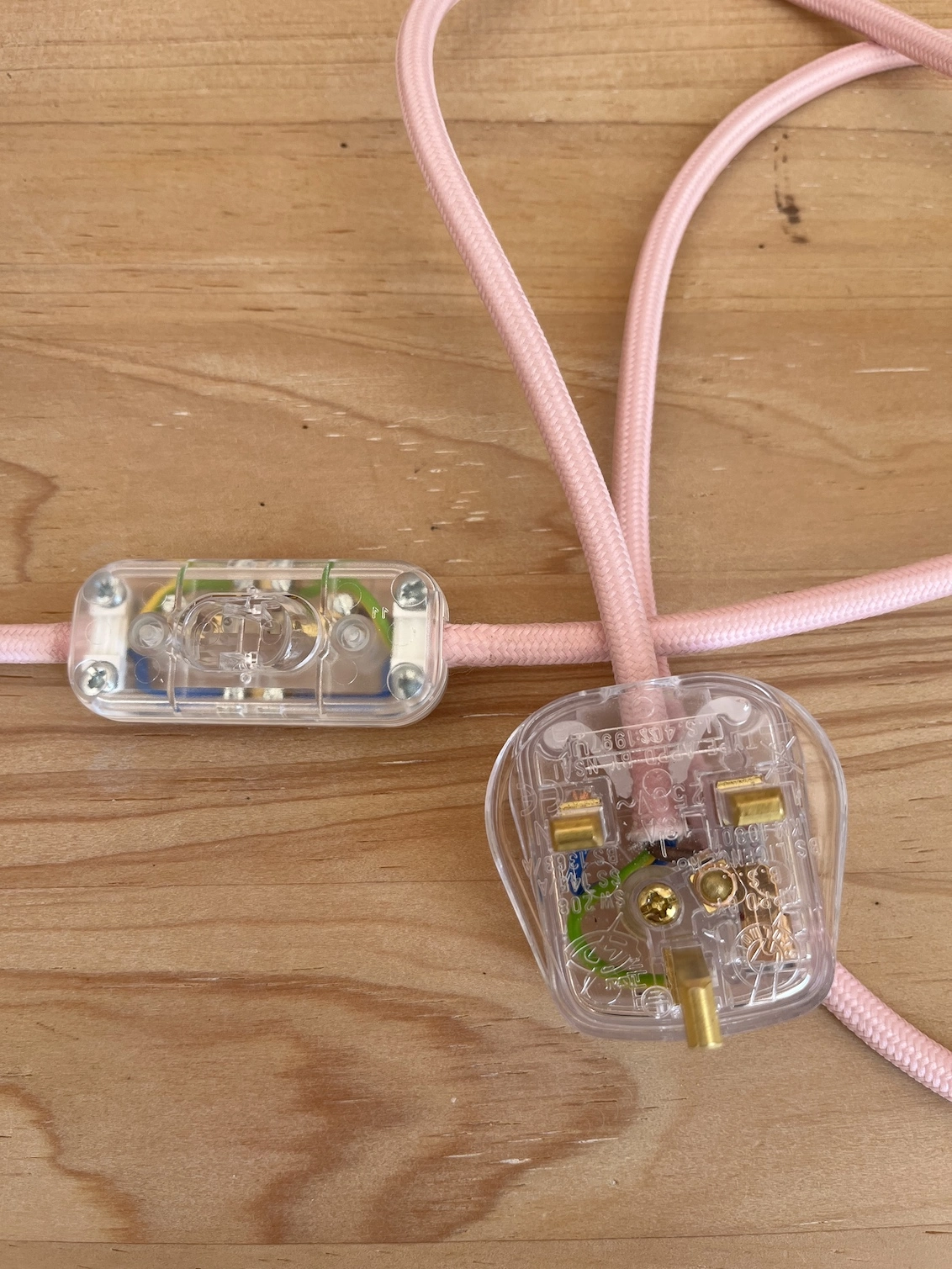 It comes with a clear UK plug and switch on a fabric pink cable. Switch is located 35cm from lamp base and the total cable length is 1.5m. This can be shorted slightly easily if required by gently pulling the cable back into the lamp base.
