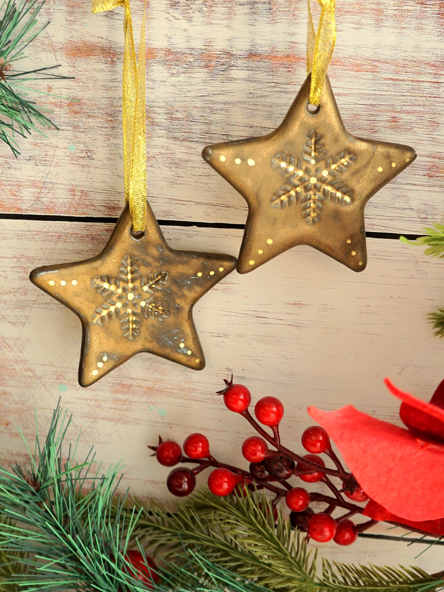 Ceramic Star Christmas Decorations, created from stoneware clay and imprinted with a delicate snowflake design and gold detailing.