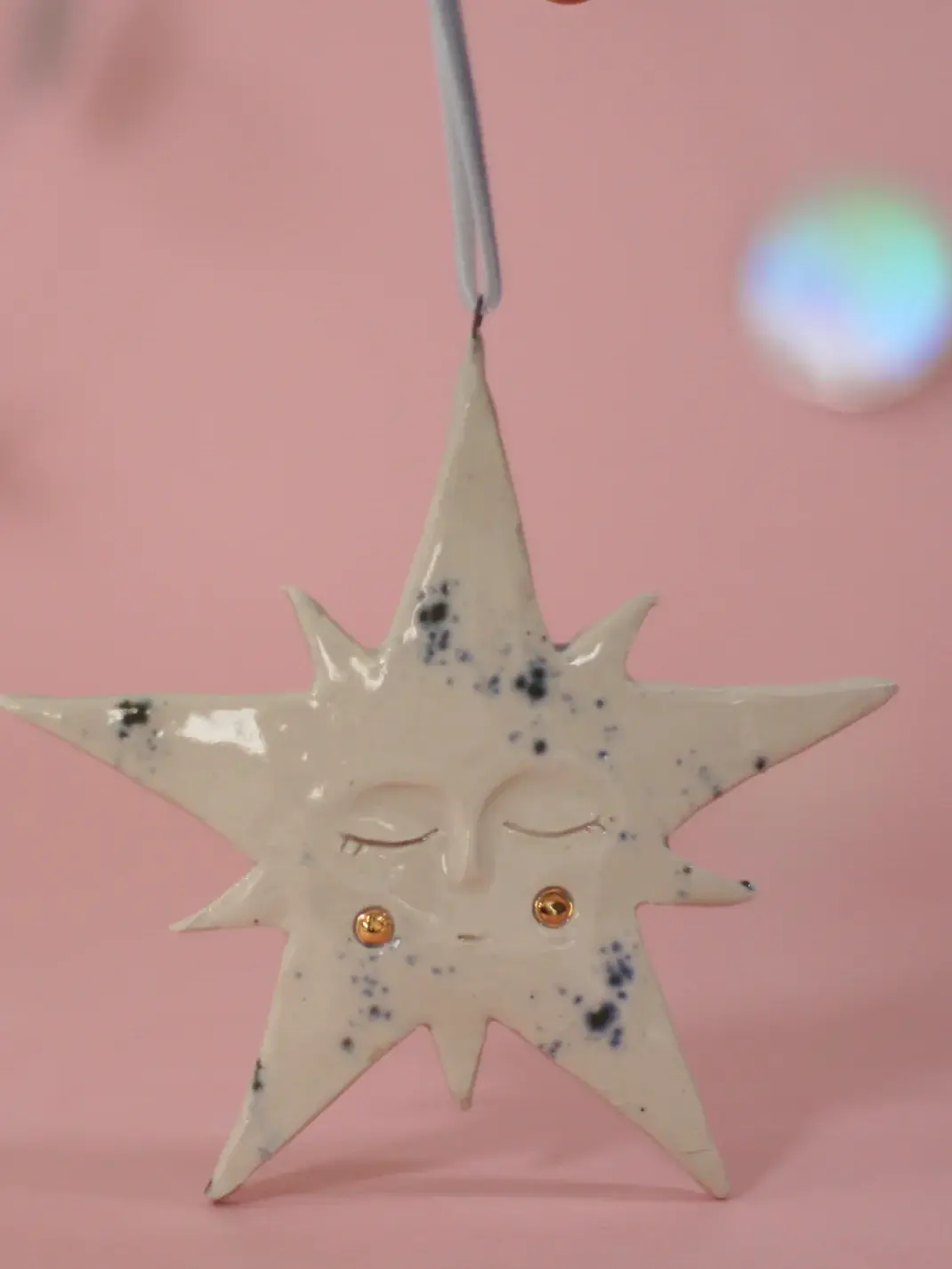 The cutest ceramic star decorations, tied with a velvet blue ribbon.
