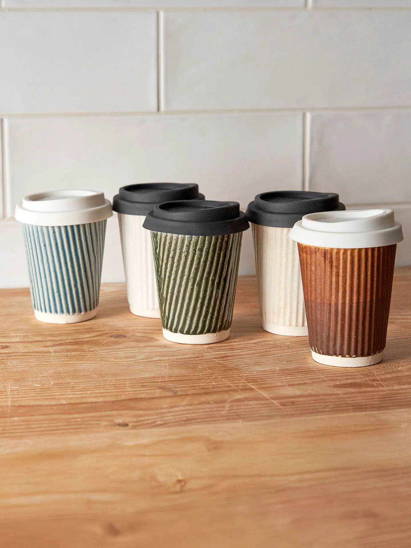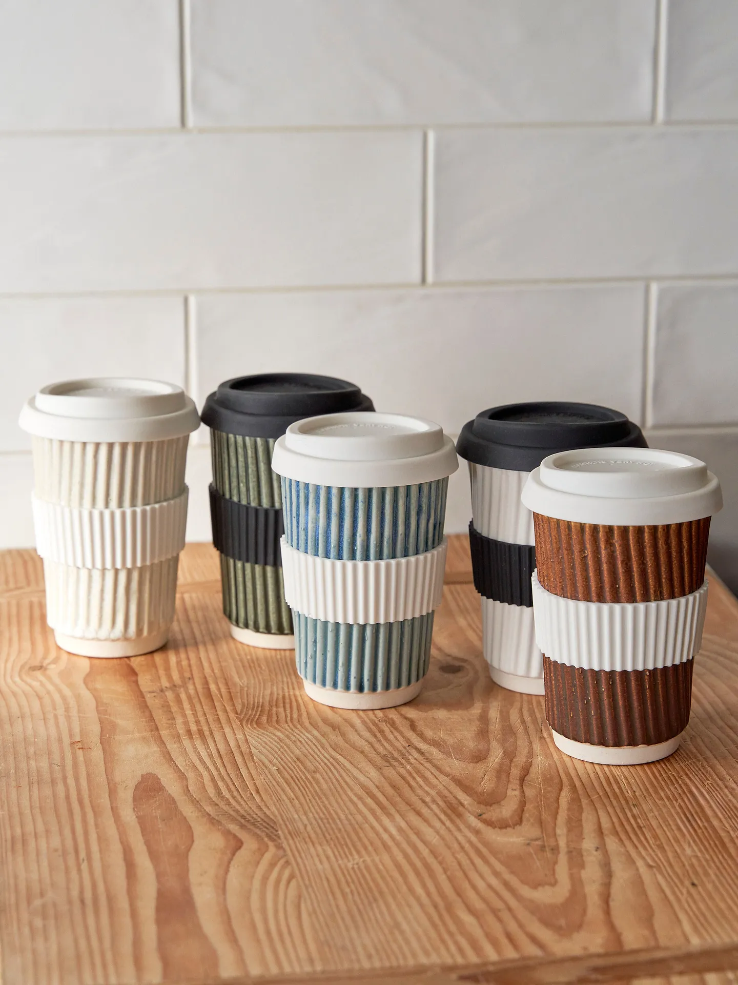 Coffee cup or ceramic travel mug. Made with fine white stoneware and a range of earthy glazes. The large mug is great to keep a cuppa going for longer as the silicone will keep it a warmer. It is the perfect gift for teachers, doctors on the go, people with longer commutes, walking round the supermarket and of course anyone who enjoys long drinks from a ceramic travel cup. The small cup is perfect for a flat white or espresso. Both will be great for cold drinks and smoothies too.