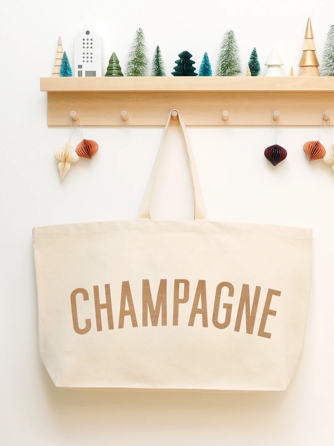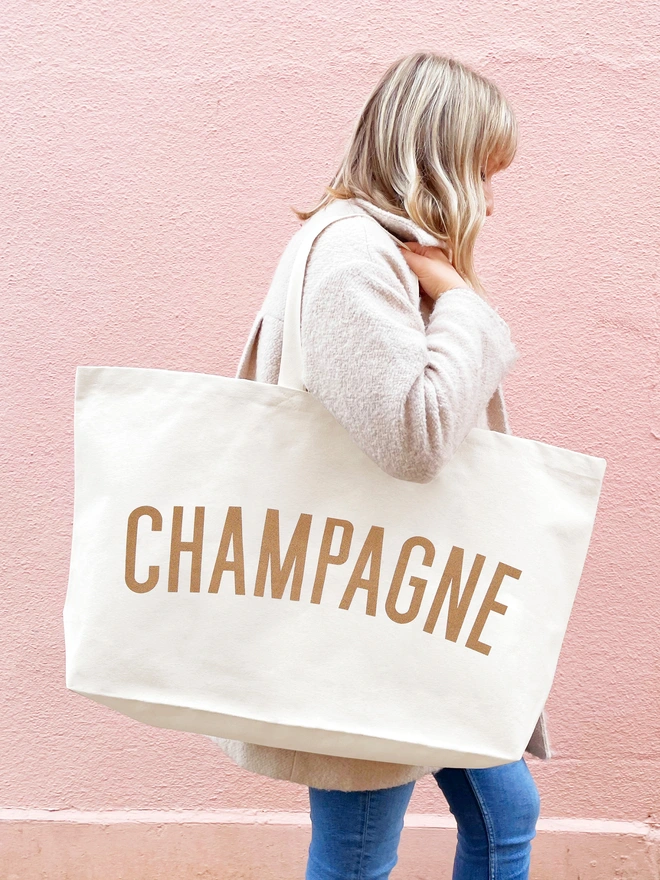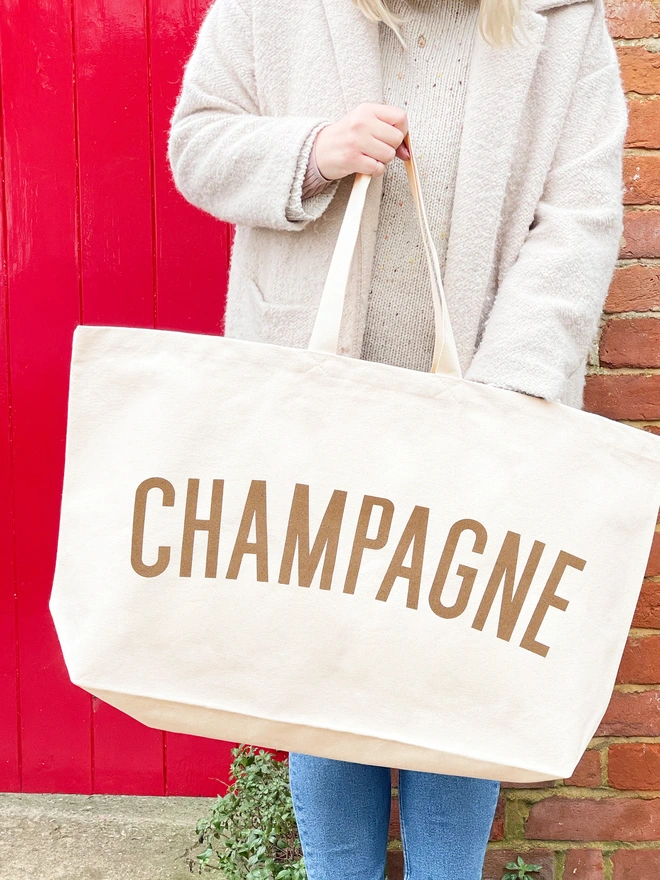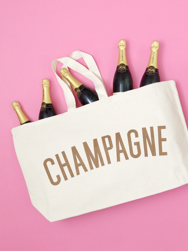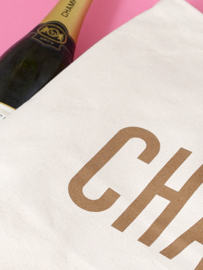 Our 'Champagne' bag has been made from heavy duty canvas, screen printed by hand big and bold. Available in a lovely neutral stone colour, natural canvas with a metallic bronze print, and a deep plum purple.