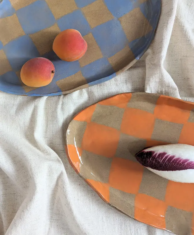 Here is our organically-shaped, irregular stoneware Checks oval plate ready to brighten up your dining tables for any occasion. Designed and made by us in our London studio. Our organically shaped, irregular stoneware pieces are hand built and hand glazed, so each piece may vary slightly in their design or colour. There will be slight imperfections as they are all made by hand. These small variations in the tones and shape make them completely unique to you!