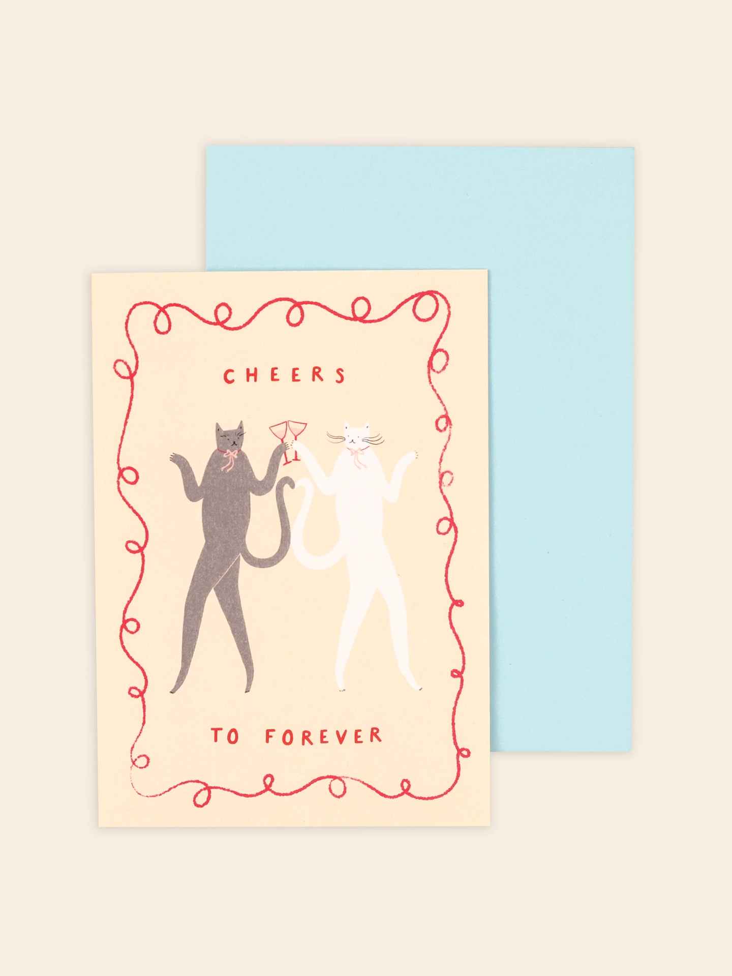 Sweet contemporary card featuring two fancy cats toasting champagne glasses. Text reads 'Cheers To Forever'. The perfect stylish card to celebrate a wedding or engagement.