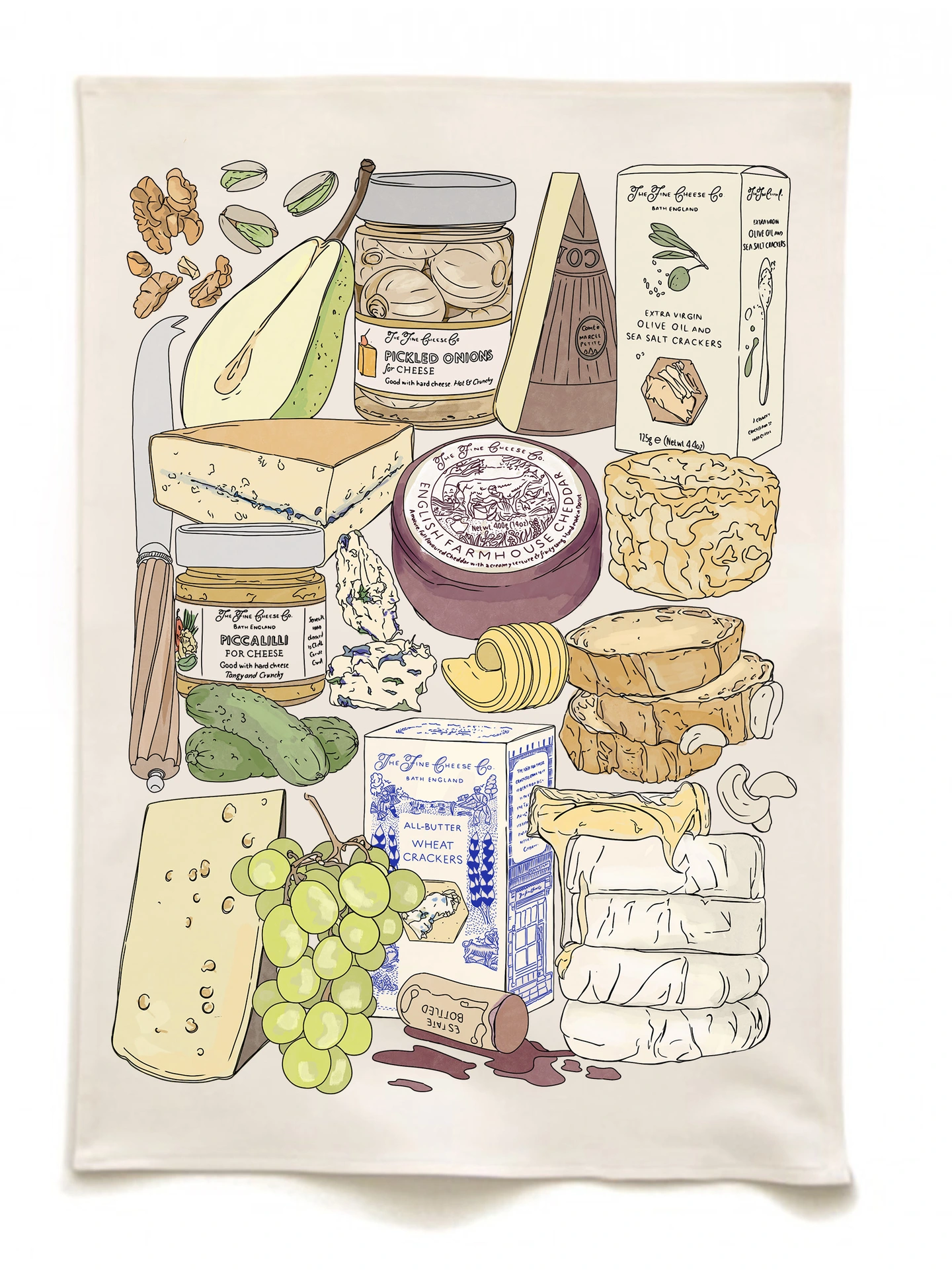 Bring your love of cheese to your kitchen with this charming, hand-illustrated tea towel celebrating the classic British cheeseboard. From wedges of cheddar and creamy brie to jars of tangy piccalilli. hand-drawn with soft watercolor tones. Proudly made i...