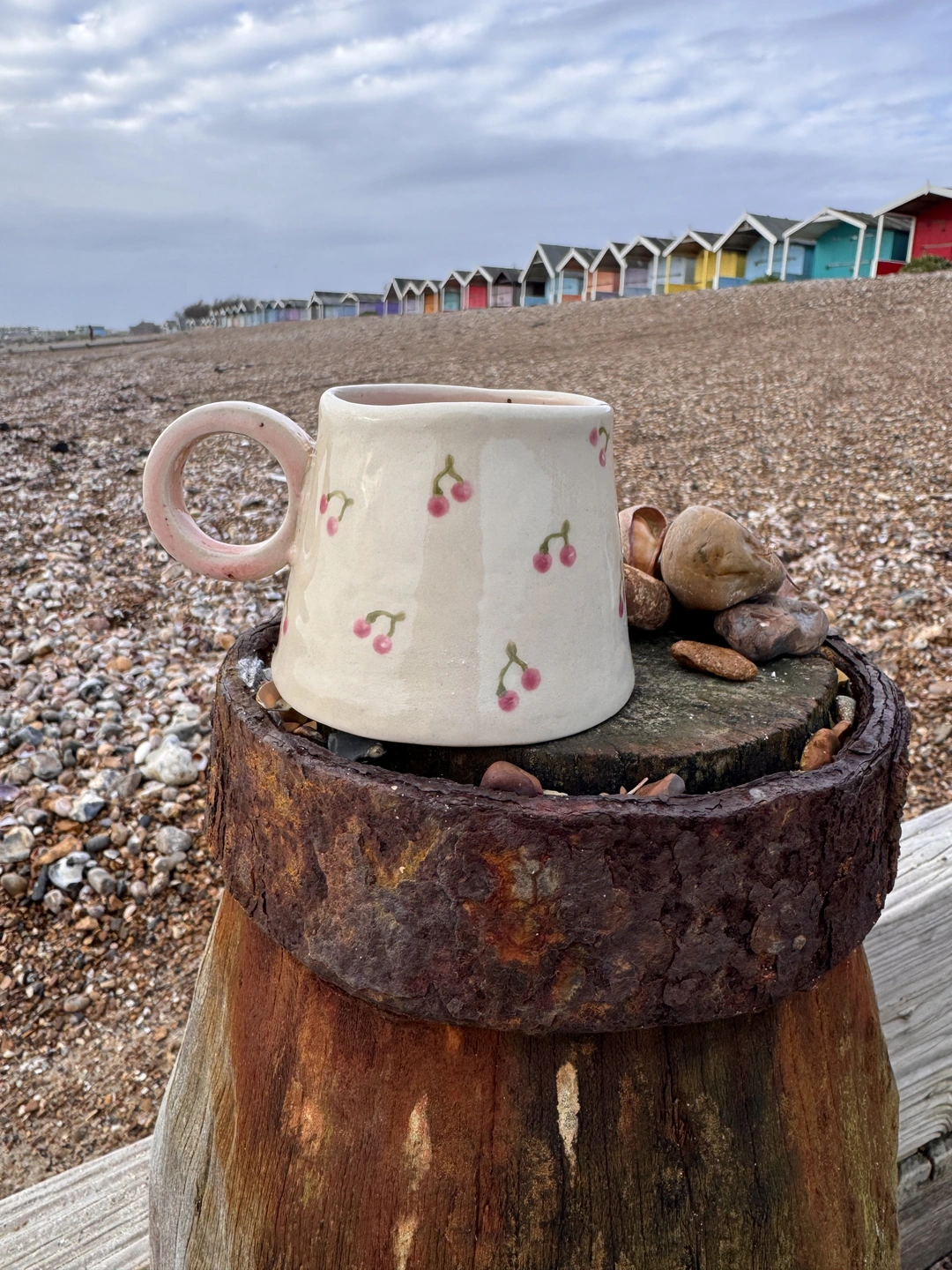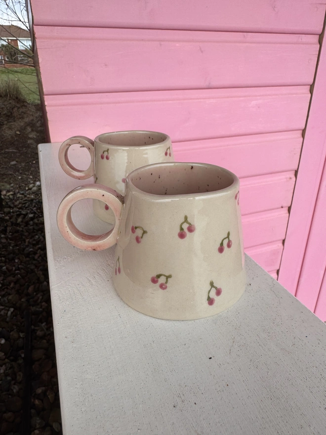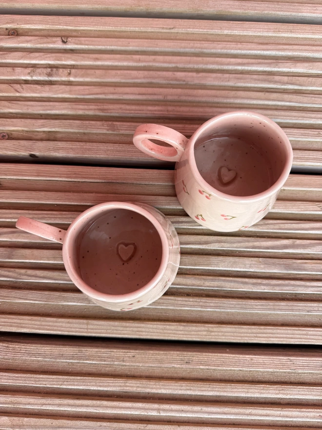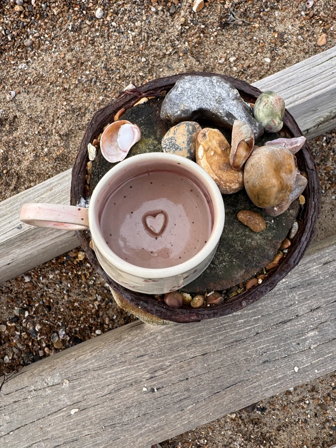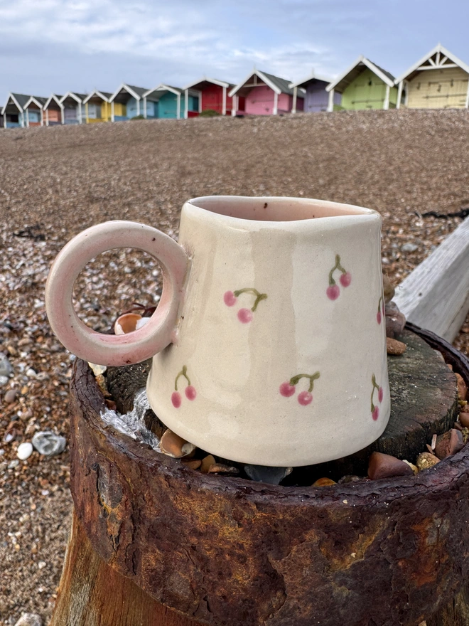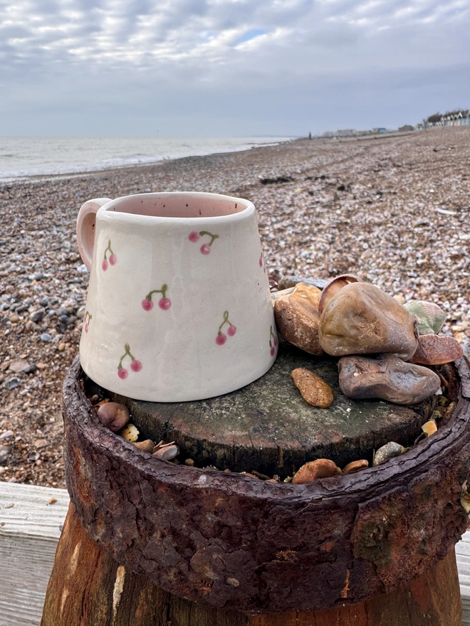 A lovely hand built ceramic stoneware hug mug, with a pretty cherry design on the outside and a speckled pink interior with a little hidden heart on the bottom. Each unique mug in this collection represents the coast, from the deep blues of the sea, to cr...
