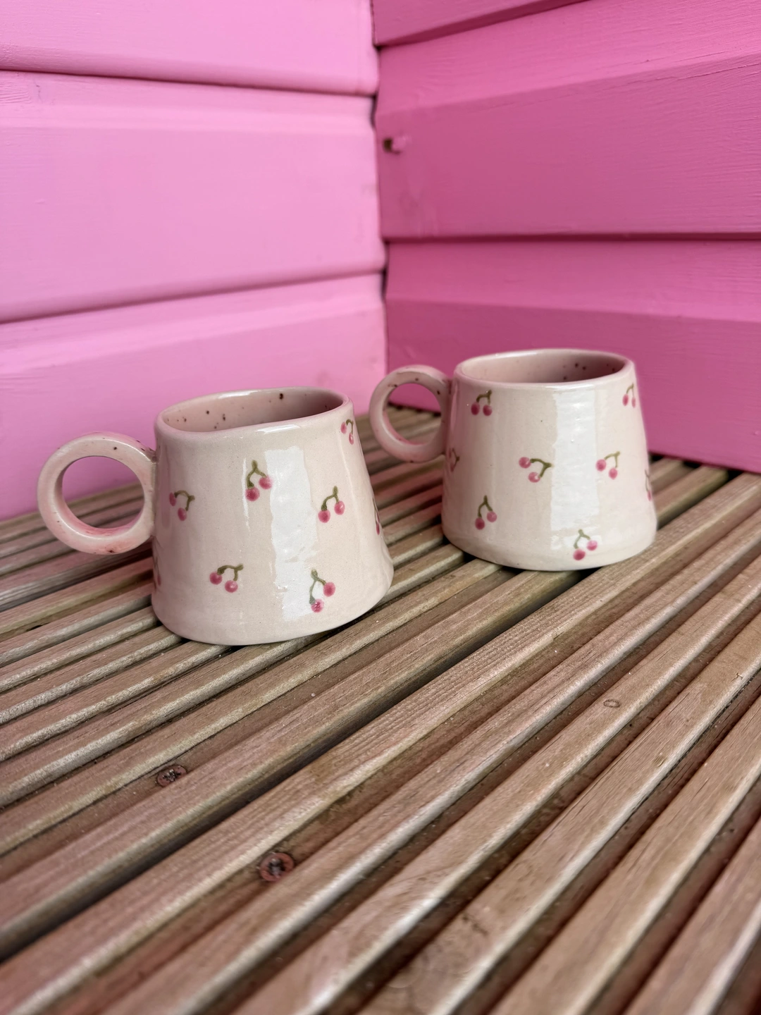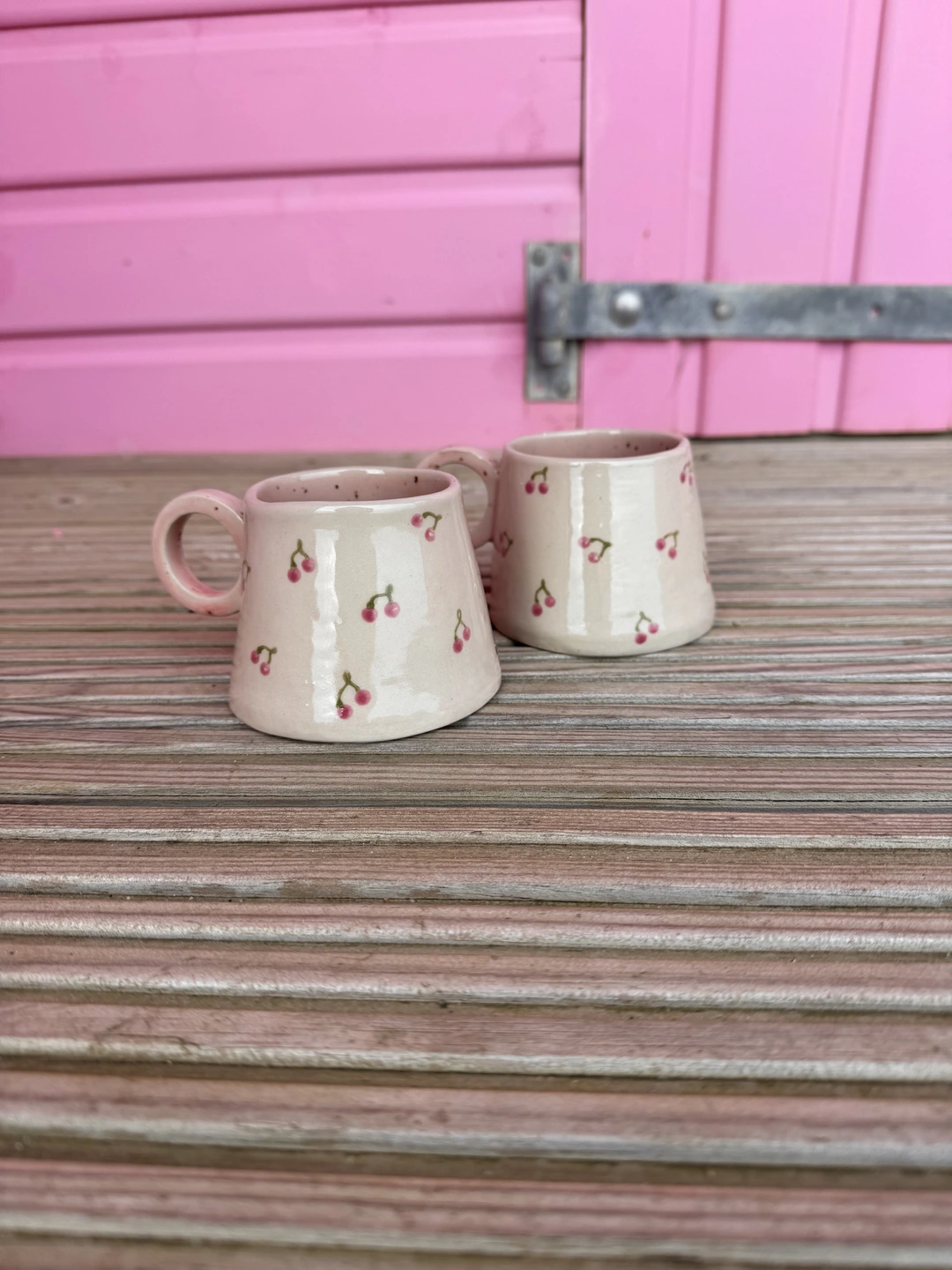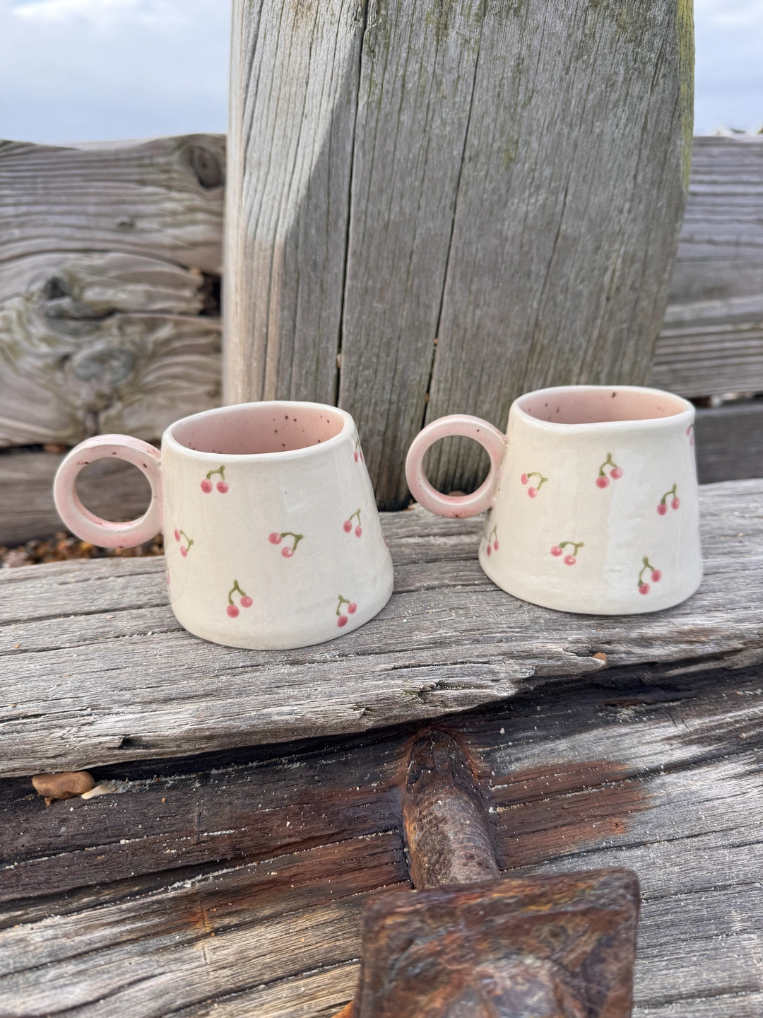 A lovely hand built ceramic stoneware hug mug, with a pretty cherry design on the outside and a speckled pink interior with a little hidden heart on the bottom. Each unique mug in this collection represents the coast, from the deep blues of the sea, to cr...