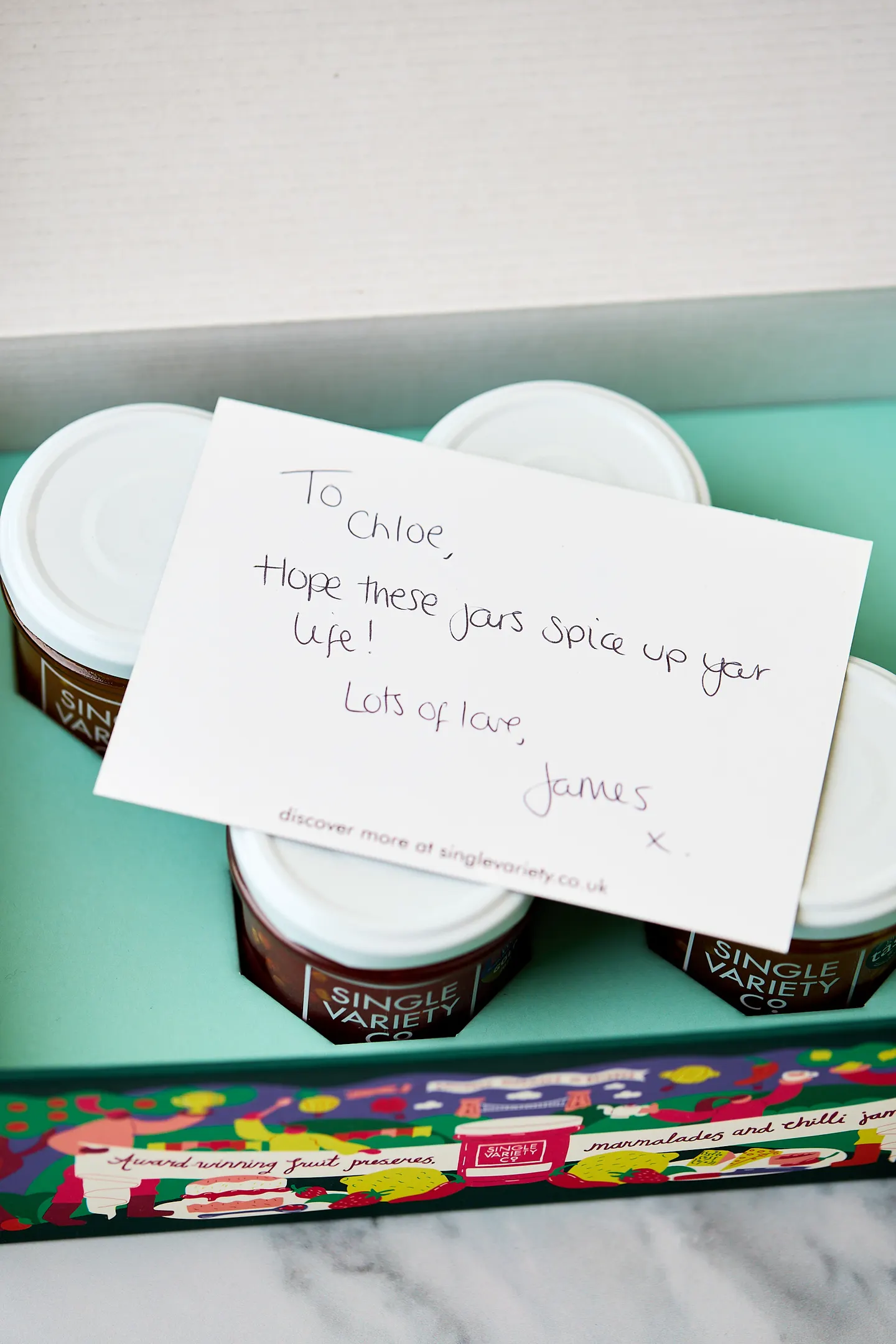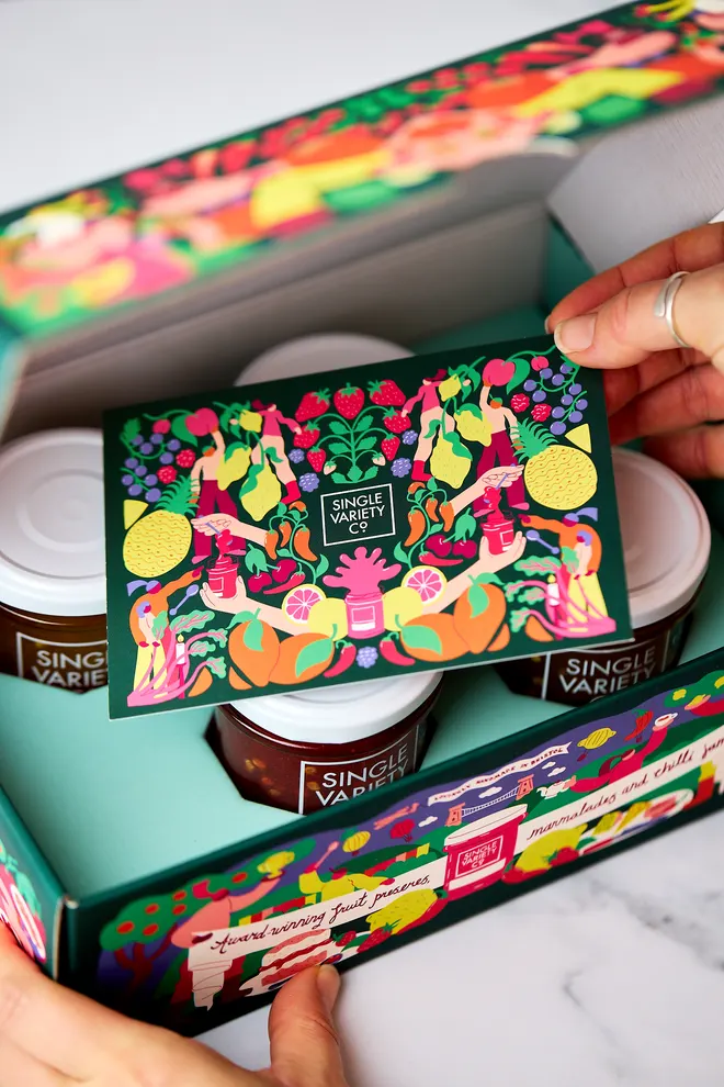 Our stunning gift box has been hand illustrated for us by local Bristol illustrator Alice Ferns, following a brief to showcase our jams from fruit to jar. There are so many surprising details on the design - every time you look you'll spot something new. Printed in a soft touch finish for a luxurious feel, the perfect box to hold our delicious jams- no need to wrap!
