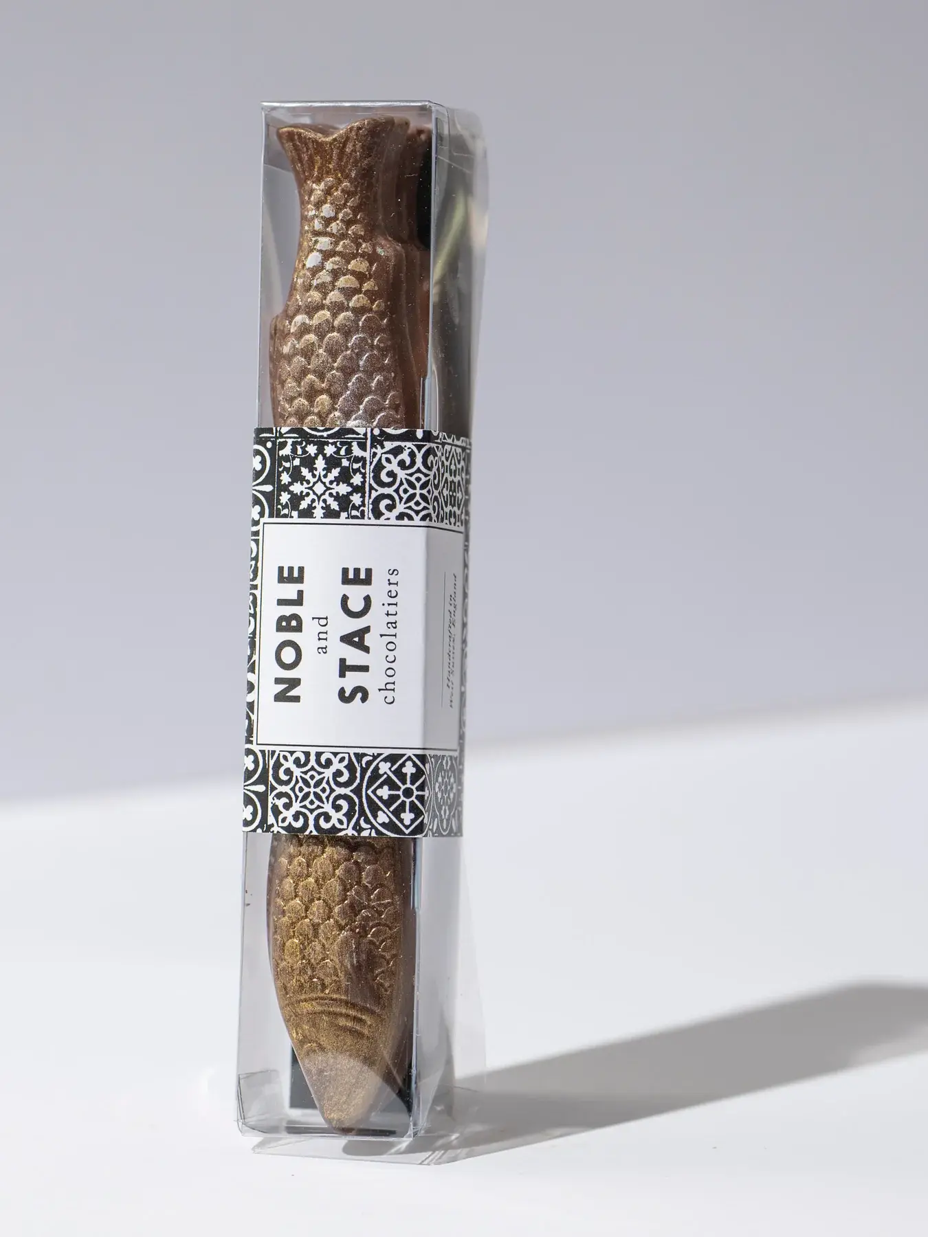 Milk and Dark solid chocolate fish, with natural colour gold and silver decoration. Each tube contains 3 milk and 3 dark chocolate fish.