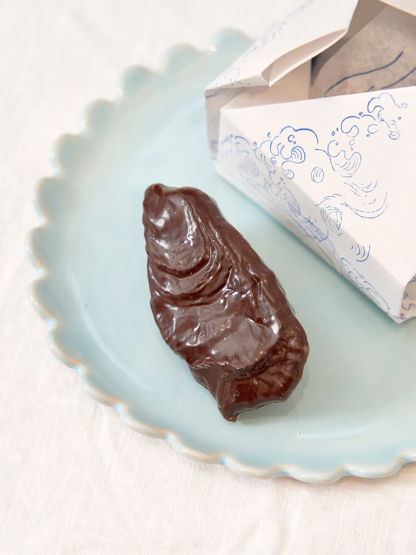 Each box contains one chocolate oyster and five chocolate seashells.