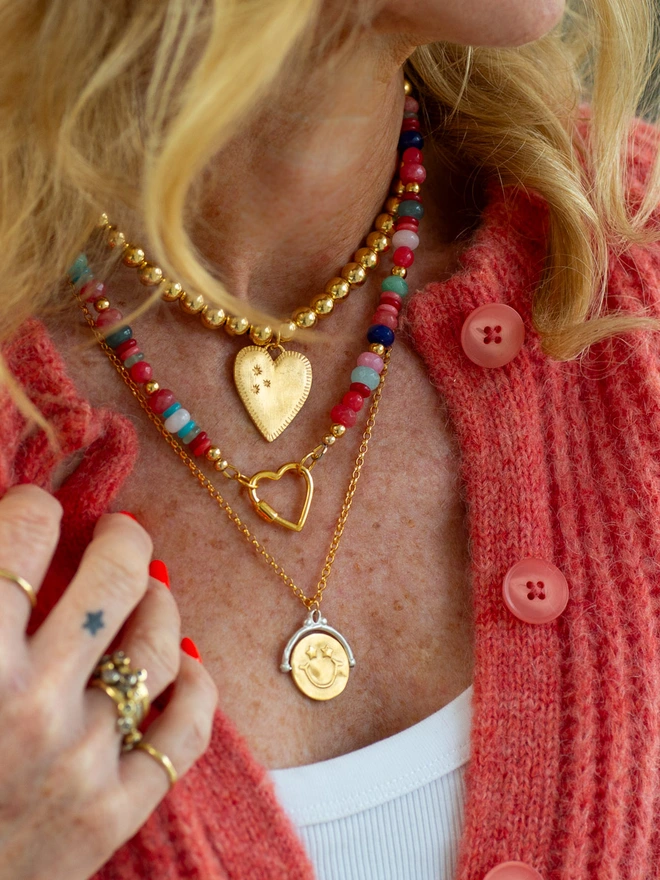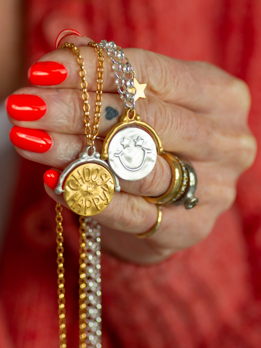 This two-tone spinner pendant in sterling silver and gold plate is designed for both comfort and meaning. Featuring a star-eyed smiley face on one side and the words “choose happy” on the other, it’s a calming piece for anxious hands — a gentle reminder to pause, breathe, and choose happiness.