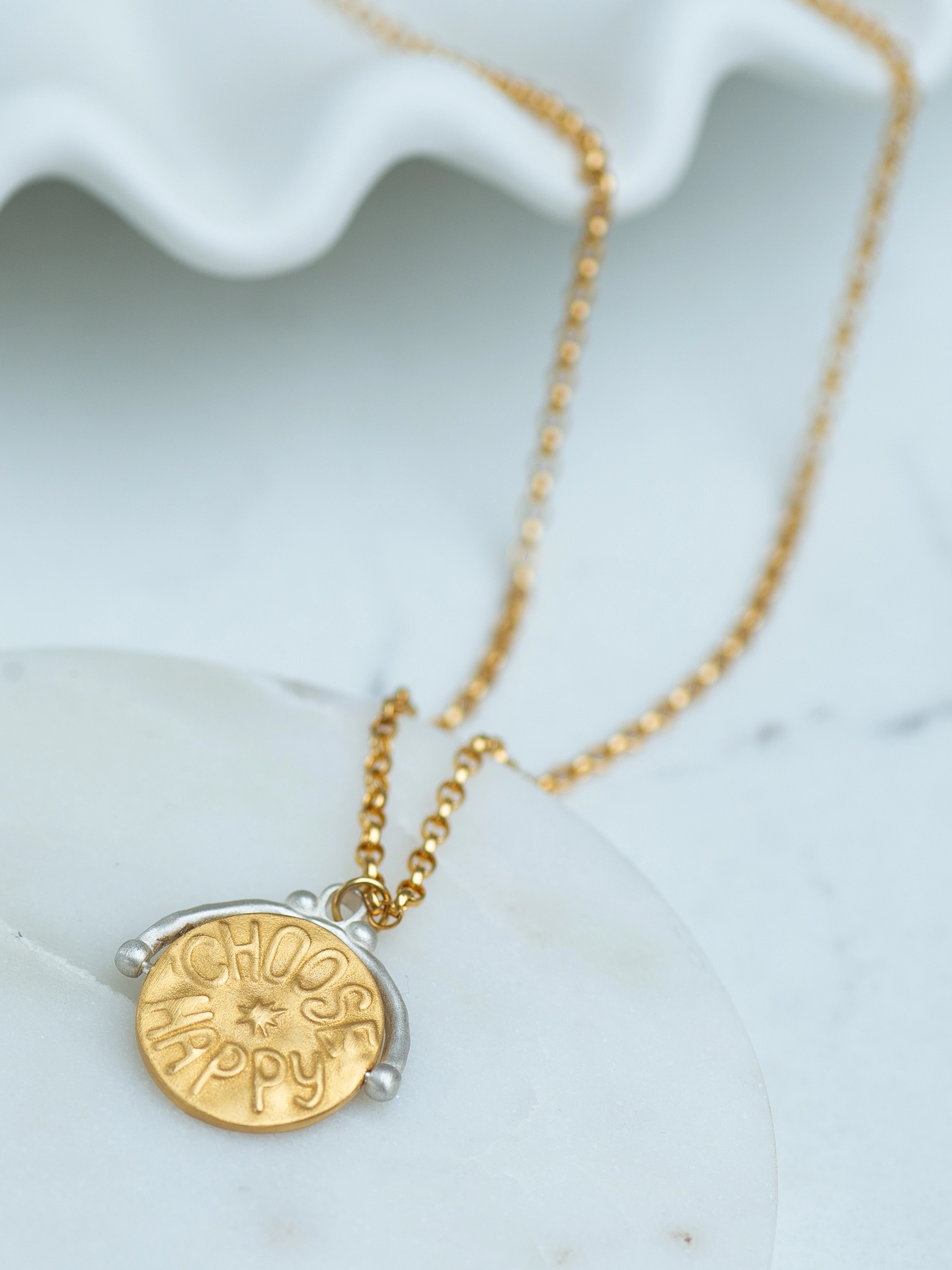 This two-tone spinner pendant in sterling silver and gold plate is designed for both comfort and meaning. Featuring a star-eyed smiley face on one side and the words “choose happy” on the other, it’s a calming piece for anxious hands — a gentle reminder t...