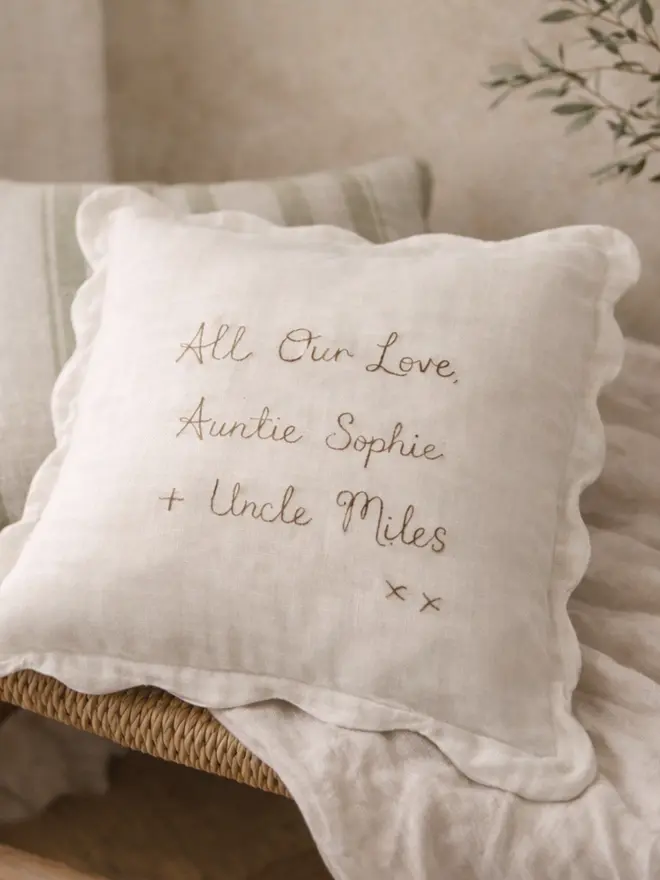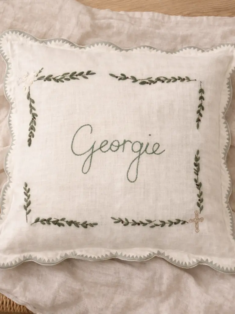 Crafted using natural materials and traditional embroidery techniques, this cushion is designed to be cherished long after the Christening day has passed.