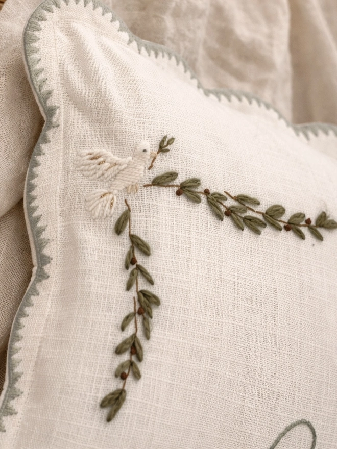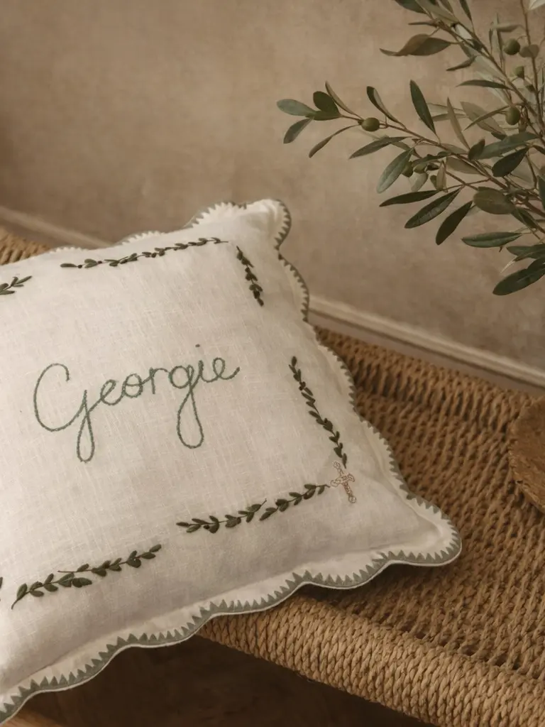 This hand-embroidered linen cushion features olive vines, doves, and soft floral details — symbols of peace, love, and blessing. The child’s name is stitched on the front in a gentle sage or ochre tone, while the reverse is finished with a handwritten message, embroidered exactly as written.