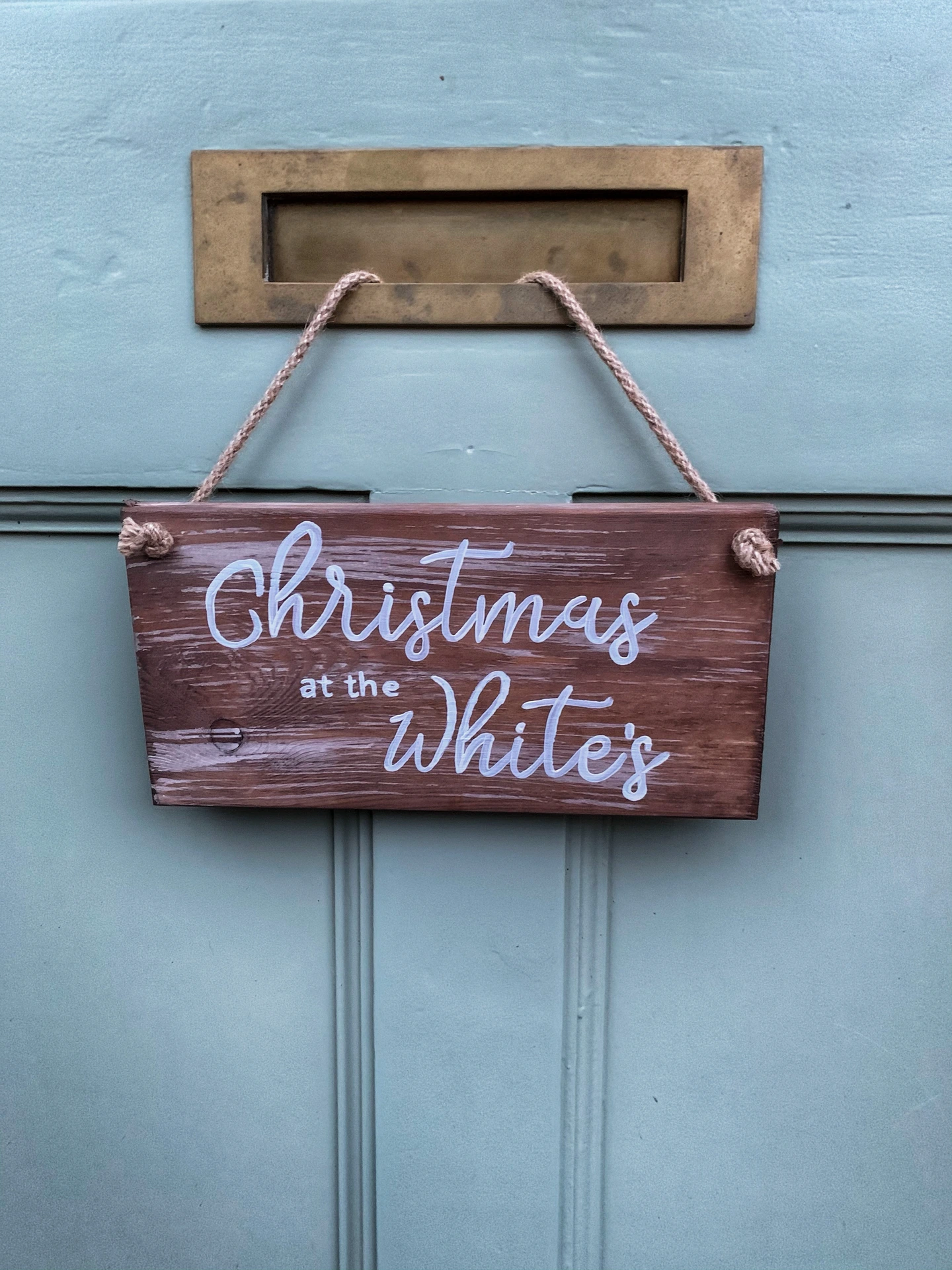 A lovingly handmade and hand-painted personalised Christmas sign — a charming addition to your festive decorations. Perfect as a thoughtful gift for newlyweds or anyone celebrating their first Christmas in a new home.