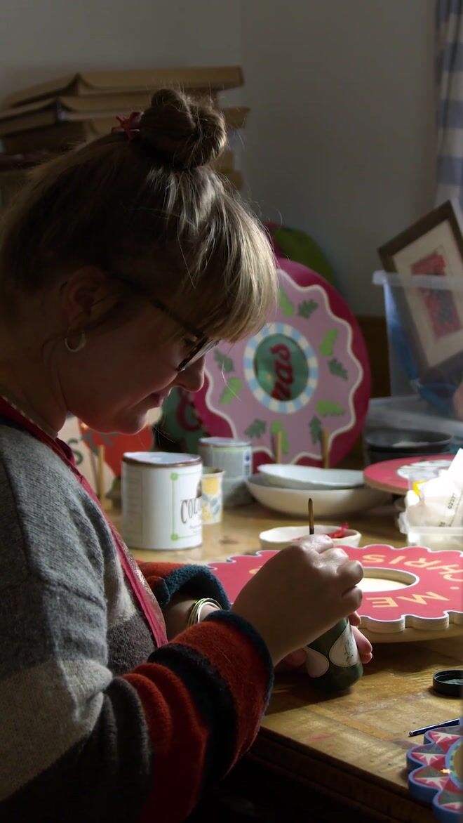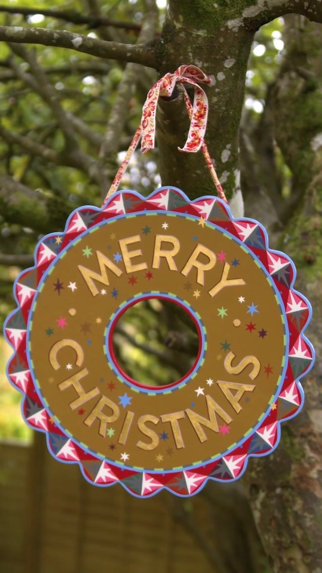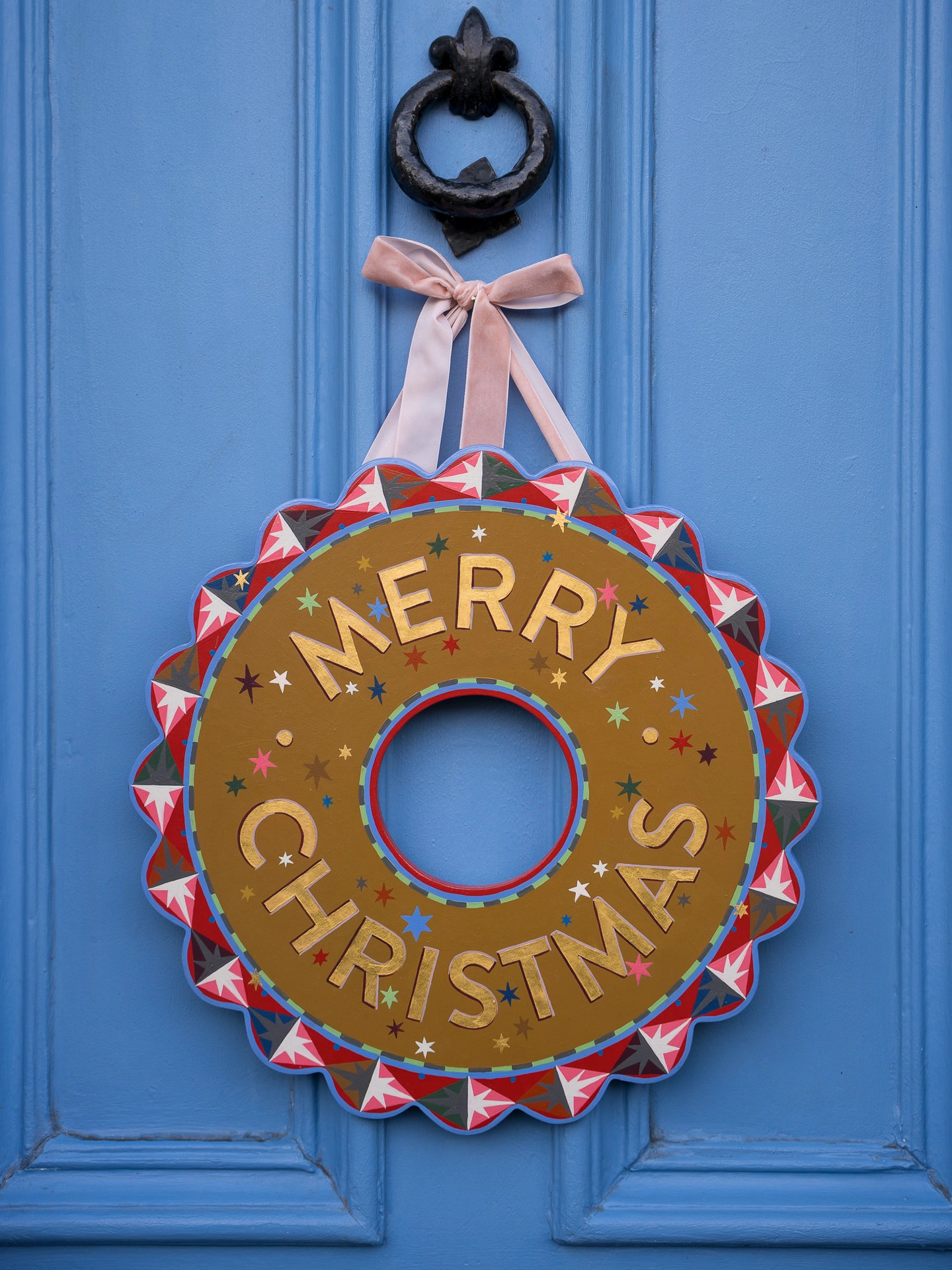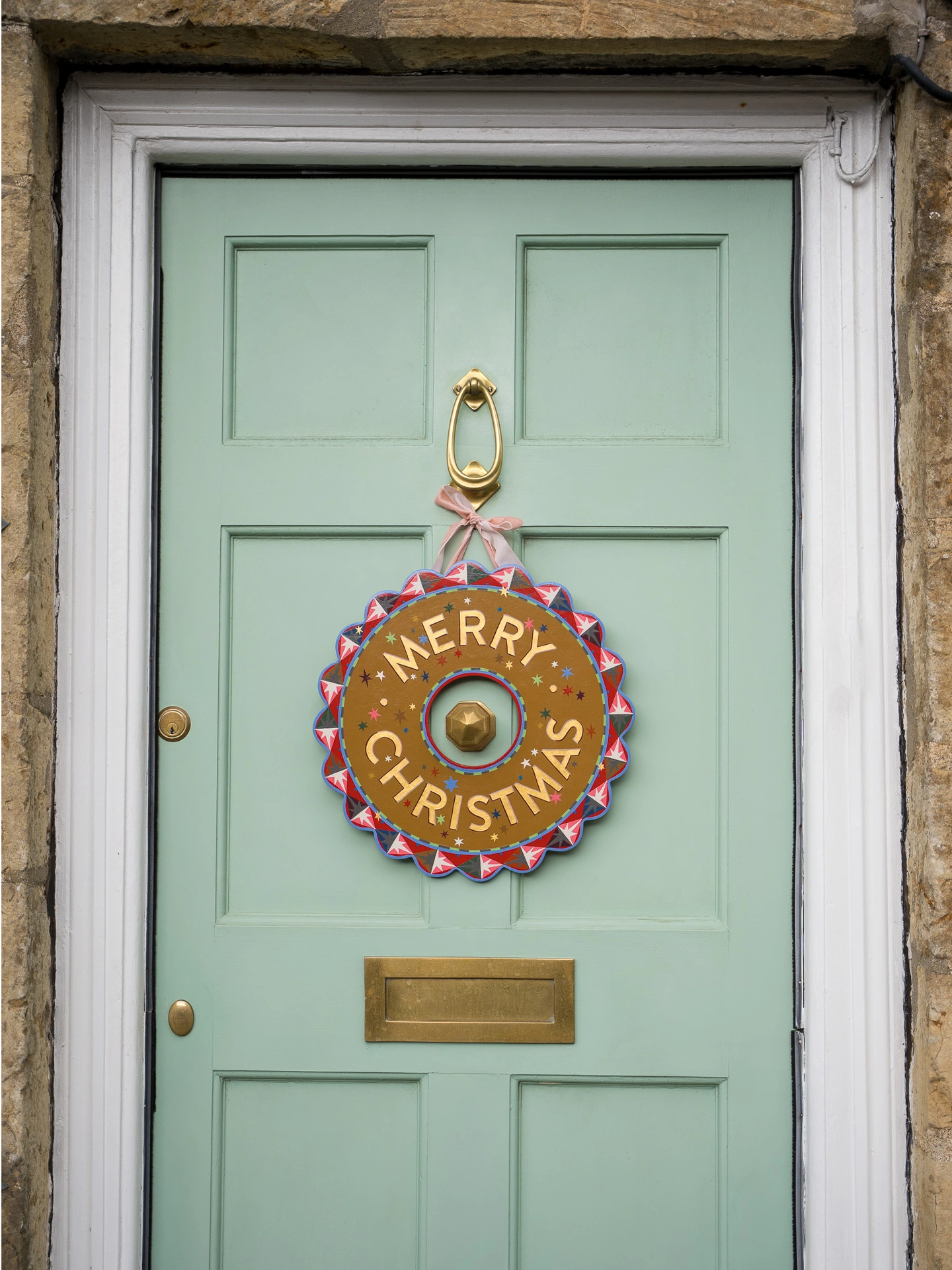 A lovingly hand painted, plywood wreath with 24 carat gold leaf lettering. Each wreath is finished with a triple coat of exterior varnish so it can be hung outside in all weathers. There are D-hooks on the back which are felt covered to protect whatever surface you choose to hang your wreath on. All wreaths come with a luxury ribbon for hanging and a hand made dust bag for storing.