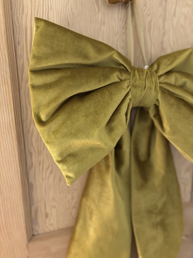 A beautiful oversized bow handmade from a stunningly vibrant chartreuse green luxury luxurious cotton velvet.