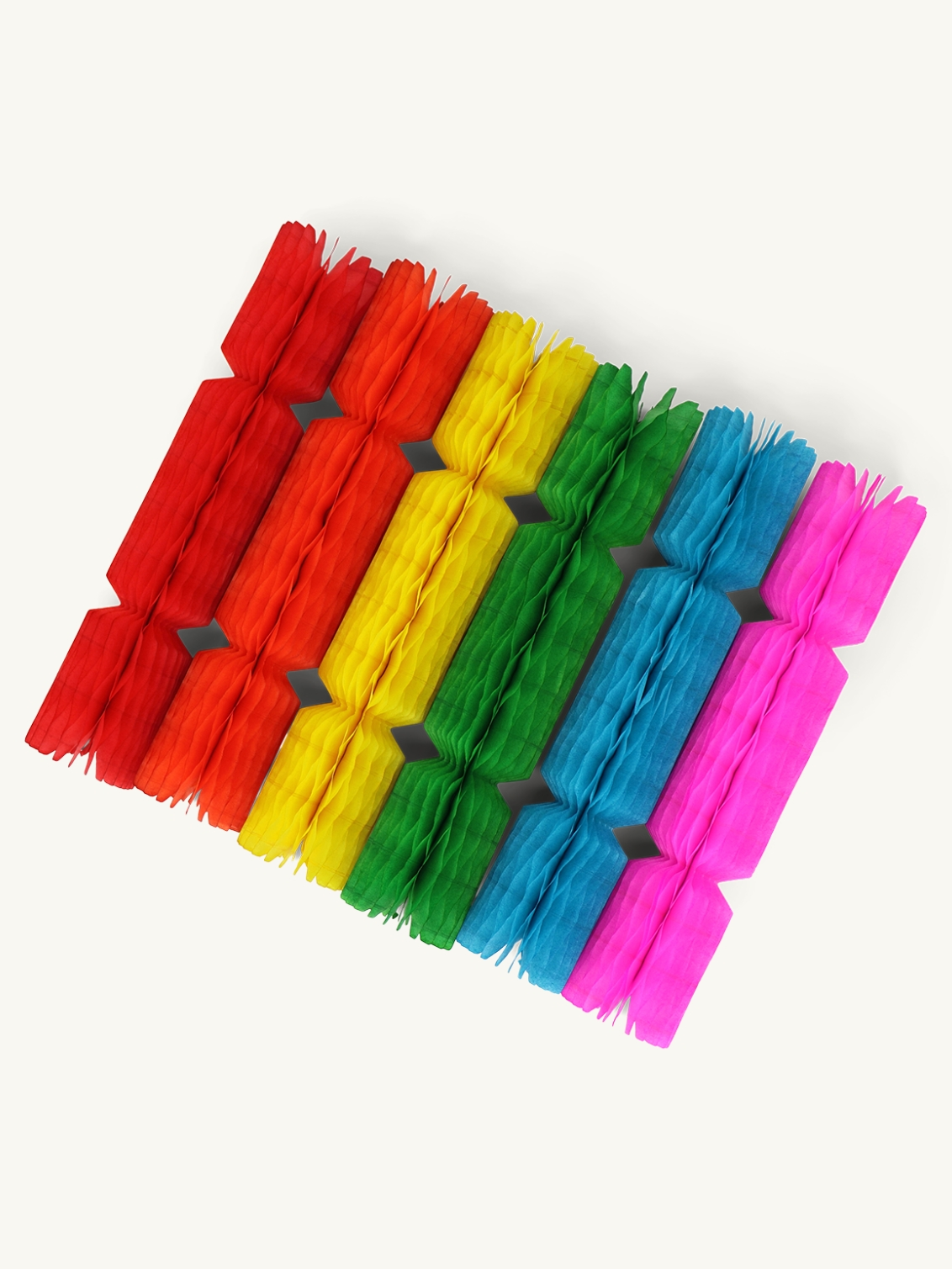 Brighten up your home with this set of paper Christmas crackers. These honeycomb crackers will make the perfect addition to any Christmas party or occasion, ideal to perch on tree branches or as table decorations. Set of 6, one of each colour. Approx 20cm in length.