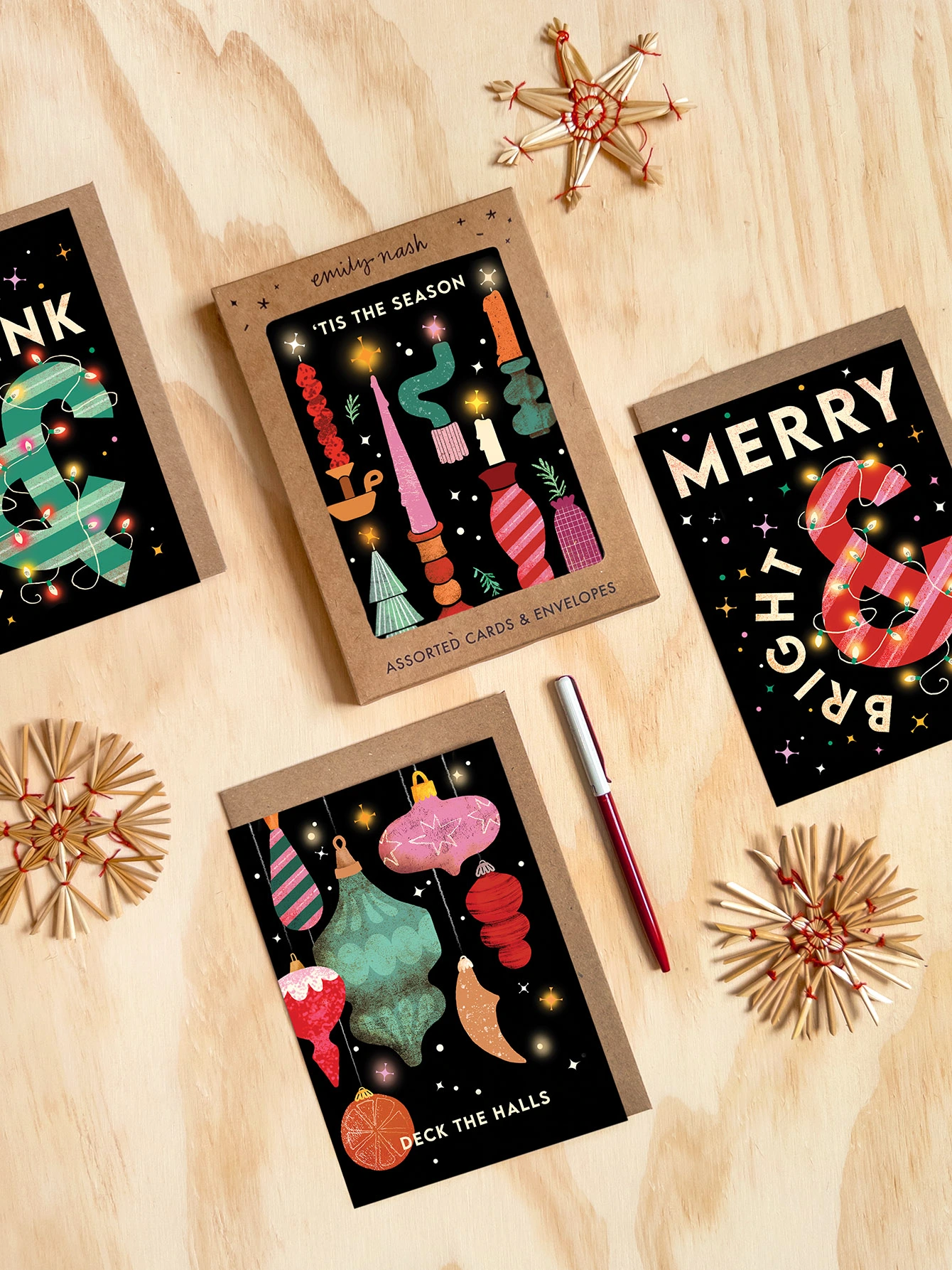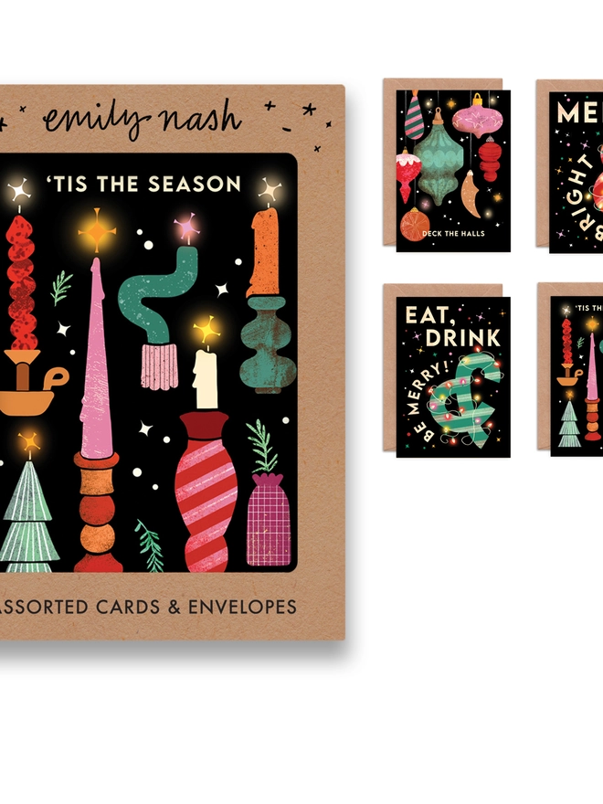 A pack of 8 festive and striking Christmas cards by Emily Nash. There are four holiday card designs in the pack, each featuring a Christmas quote and matching contemporary illustration. Send your friends and family something a little different this Christmas!