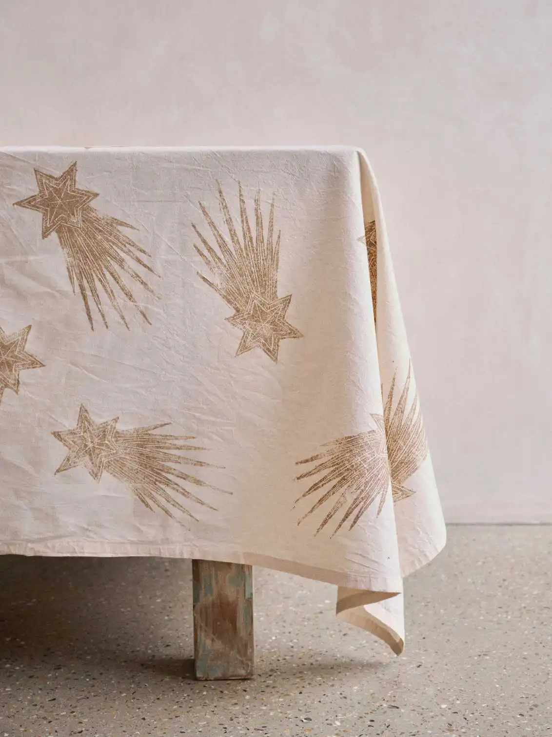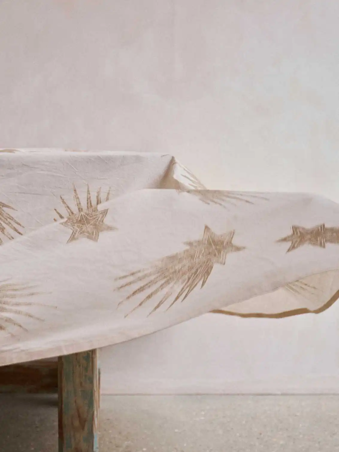 A festive tablecloth that brings a quiet elegance of Christmas to the table. Screen printed in London with golden stars, it’s made for candlelit feasts, the clink of glasses, and the joy of gathering together.