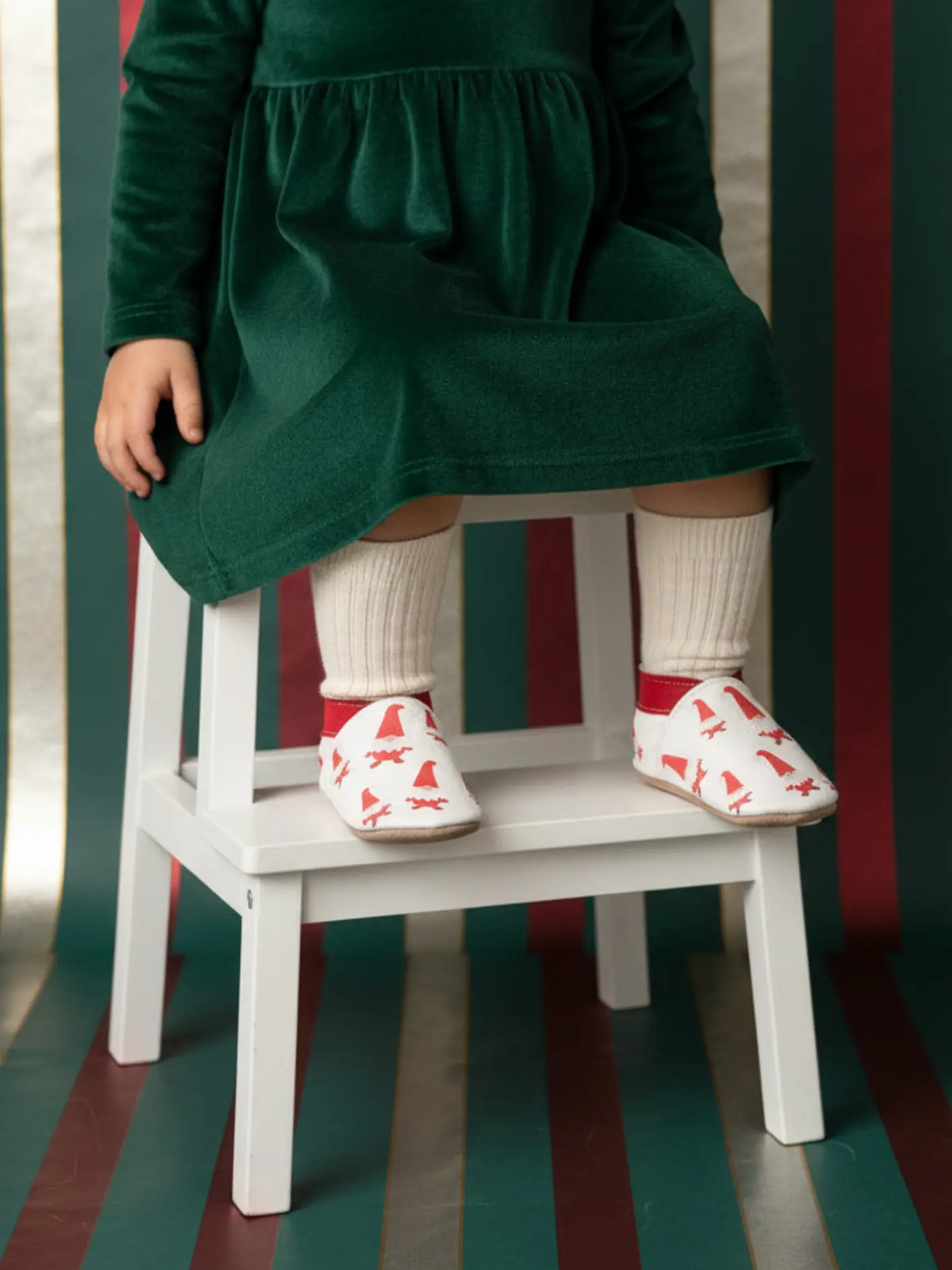 These white leather baby shoes feature a playful red Santa Gonk print, adding a touch of festive flair to your little one's outfit. Crafted from soft leather, they ensure comfort and protection for tiny feet as they explore the world. The elasticated ankle keeps these adorable shoes in place during all their crawling and toddling adventures.