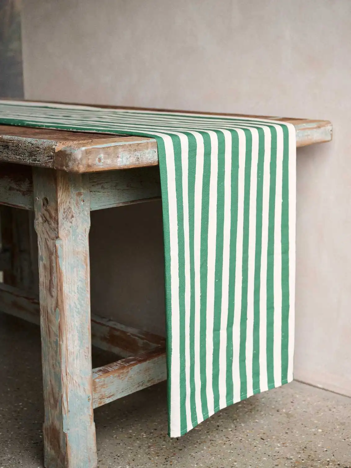 A classic with a festive twist. Our Christmas Green Stripe Table runner brings warmth and understated joy to the holiday table. With rich green stripes on cotton/linen, it’s bold yet timeless—made for Christmas feasts, cosy breakfasts, and everything in b...