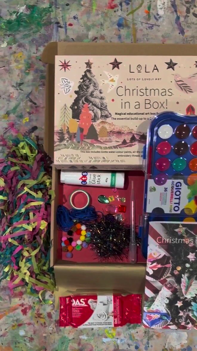Contains art materials: a set of Giotto water-colours, Das clay, a pipette, coloured tape, mini pompoms, tinsel wool, embroidery thread, gold leaf, large paper, templates and water-colour cards