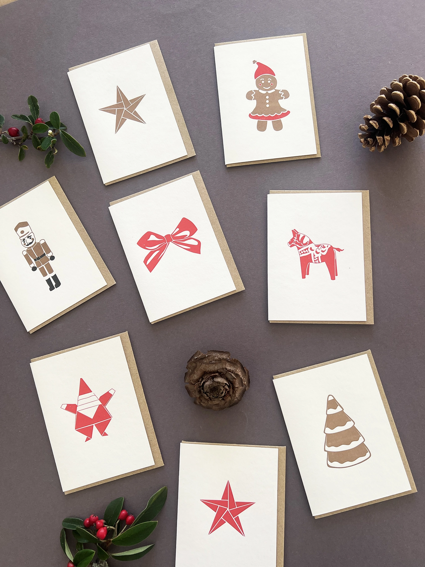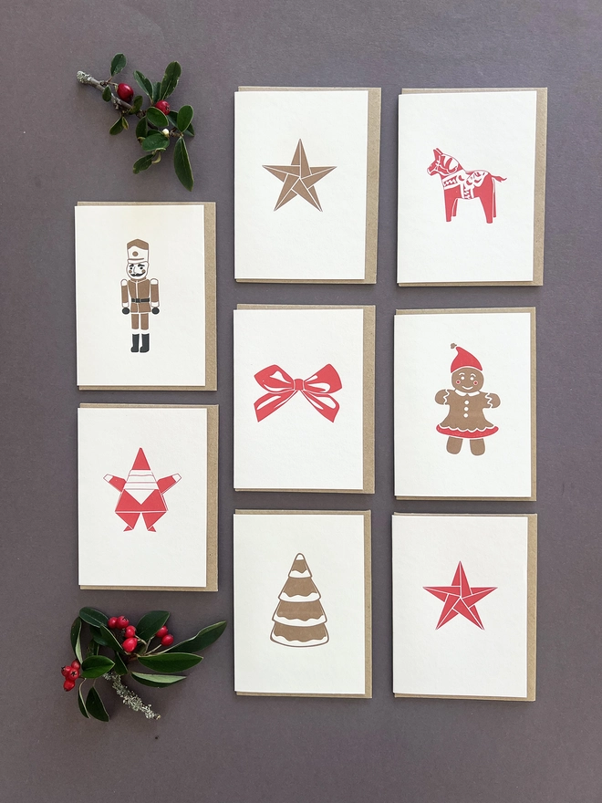The set includes two of each design; Father Christmas, Toy horse, Star and bow all printed in festive red and Gingerbread lady and tree, star and Toy Solider, printed in metallic bronze.