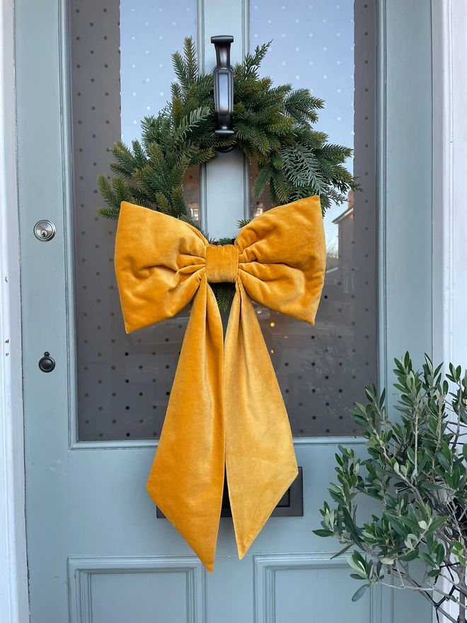 A beautiful oversized bow handmade from a luxurious vibrant mustard yellow cotton velvet.