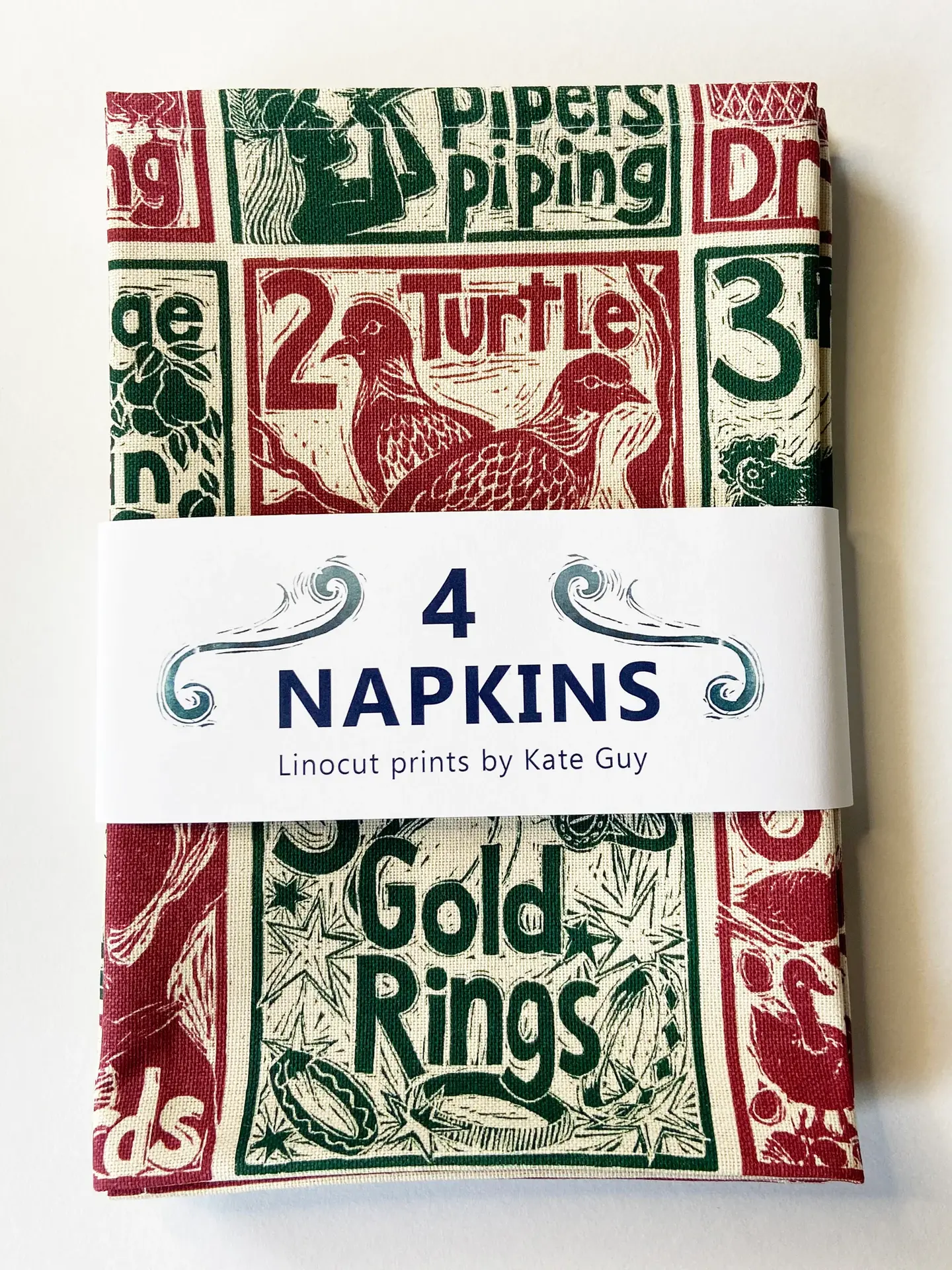 Using my unique system of linocut blocks, these organic cotton napkins illustrate the traditional Christmas song - depicting all twelve days; a partridge in a pear tree, 2 turtle doves, 3 French hens, 4 Colly birds, 5 gold rings, 6 geese, 7 swans, 8 maids...