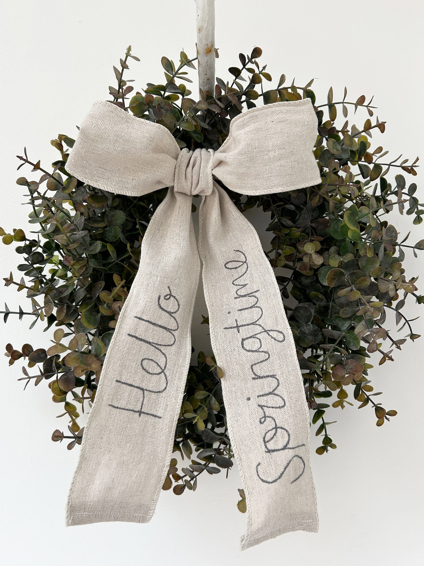 Decorate a wreath, vase or tree , suitable for home decorations and celebrations, this wired linen ribbon can be personalised with your choice of house name or sentiment, eg Lavender Cottage/ Just Married...