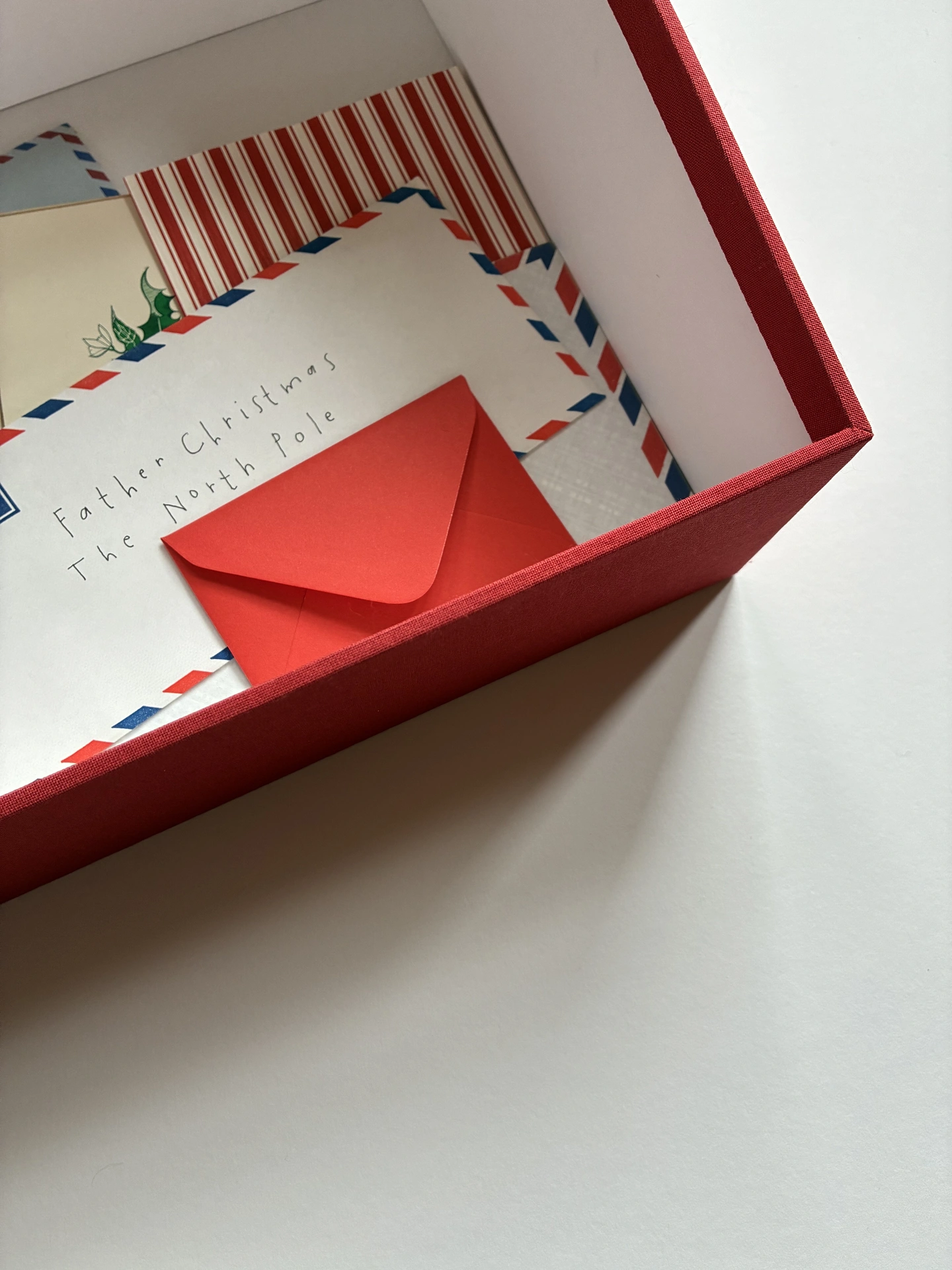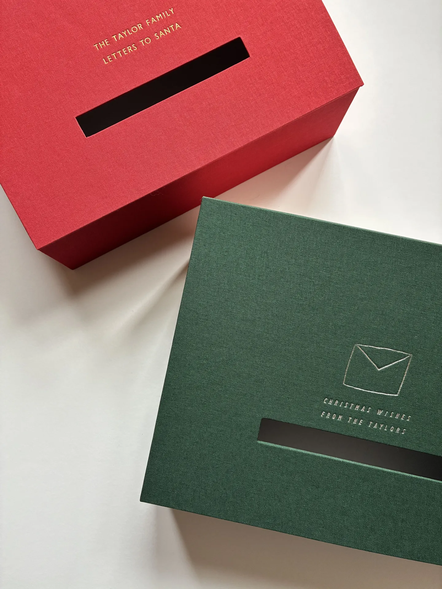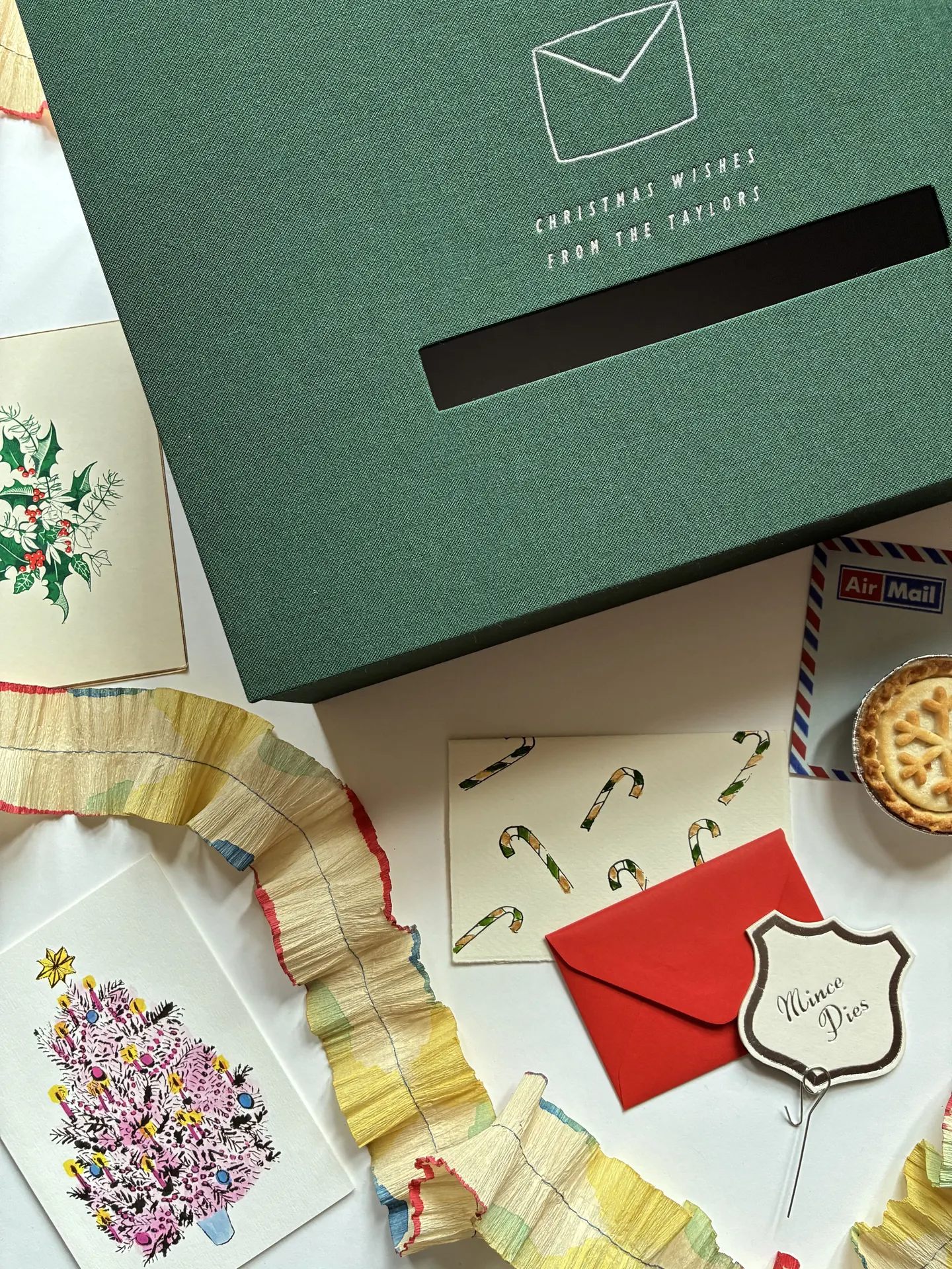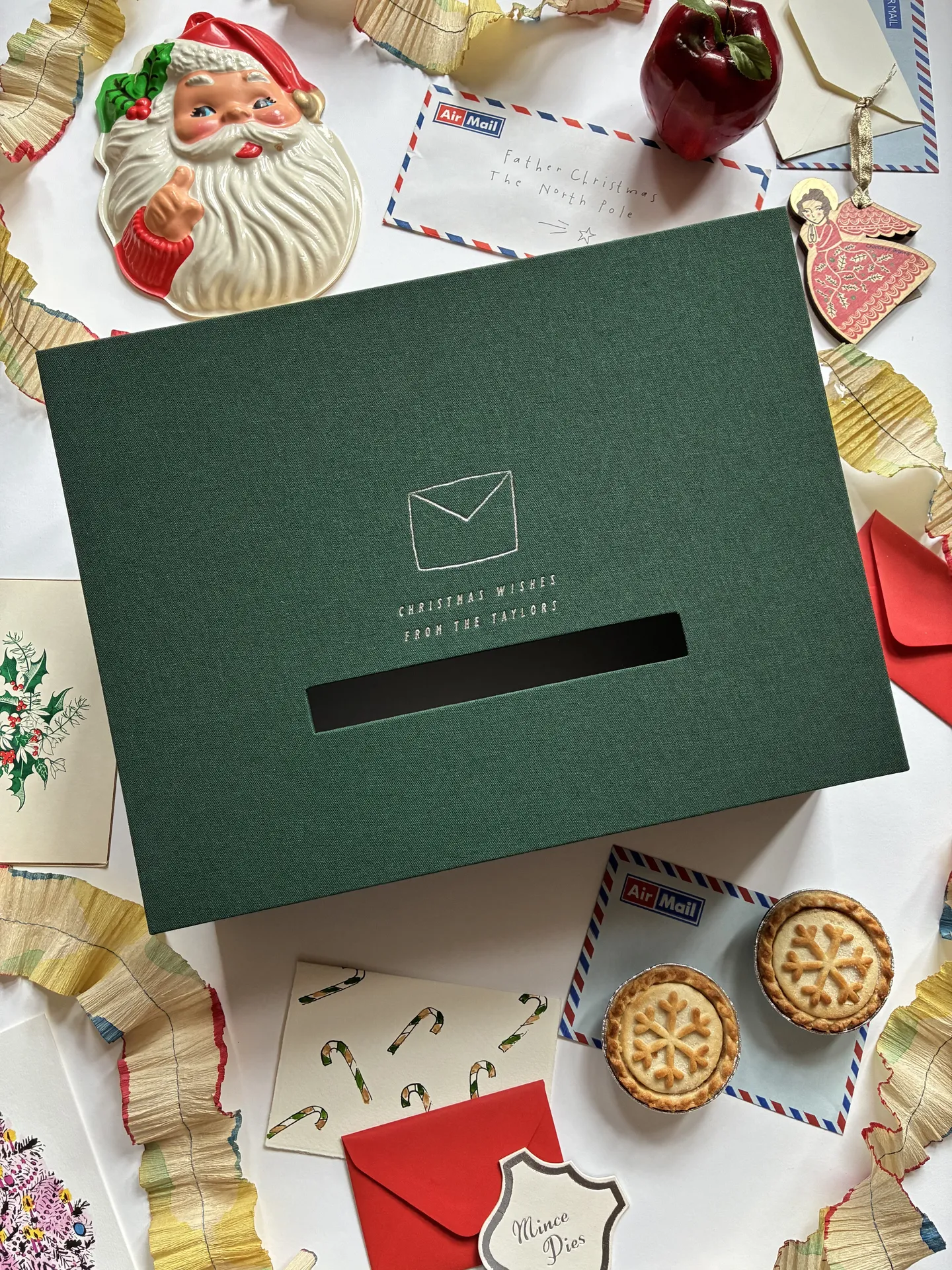 Covered in a beautiful linen cloth, choose from either traditional Pillar Box Red or a rich Forest Green. Next add some sparkle with personalisation in a metallic foil of your choice to make it extra special. Lettering can be added to the lid in either my signature typeface, ‘Coronation’ or in ‘Society’, a dainty italic typeface. The wonderful envelope design (ever thankful to Alice Gabb) can also be added with either typeface option.