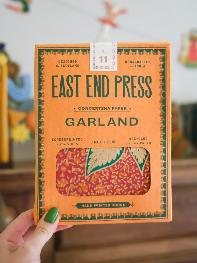 This garland is hand-printed on both sides and made from thick handmade paper created from entirely recycled content.